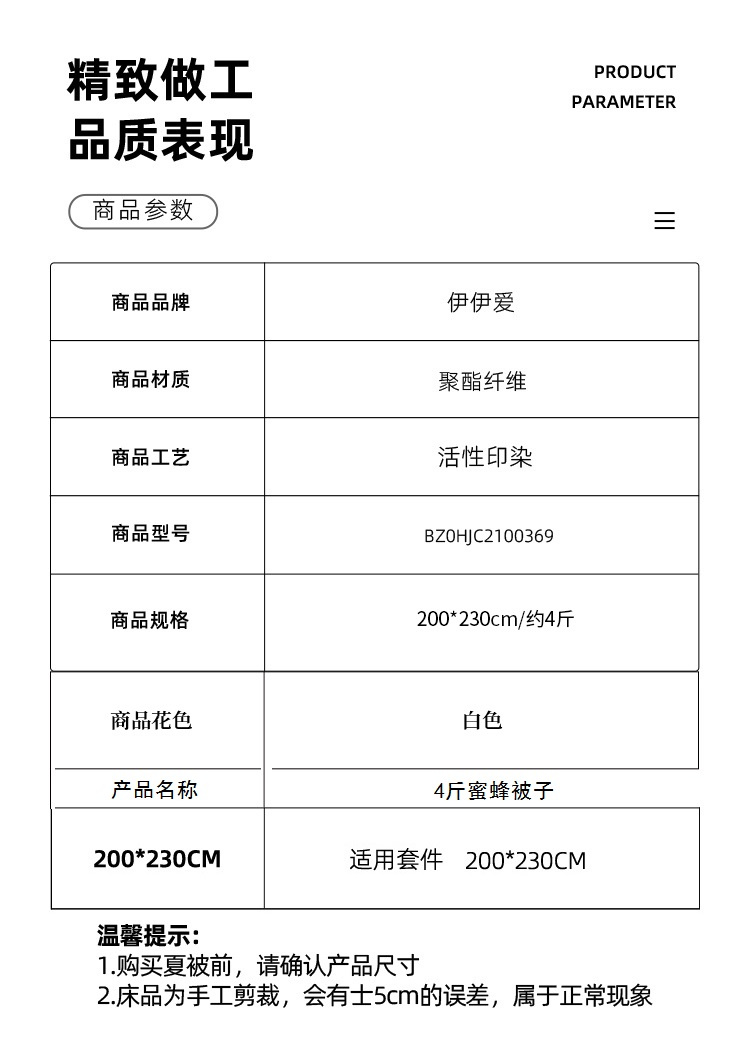 商品名称:伊伊爱BZ0HJC2100369蜜蜂被子200*230cm总重4斤(单位:条)