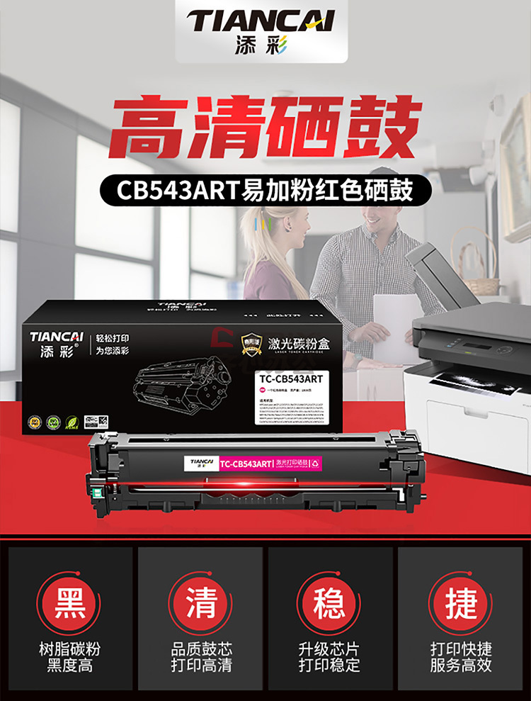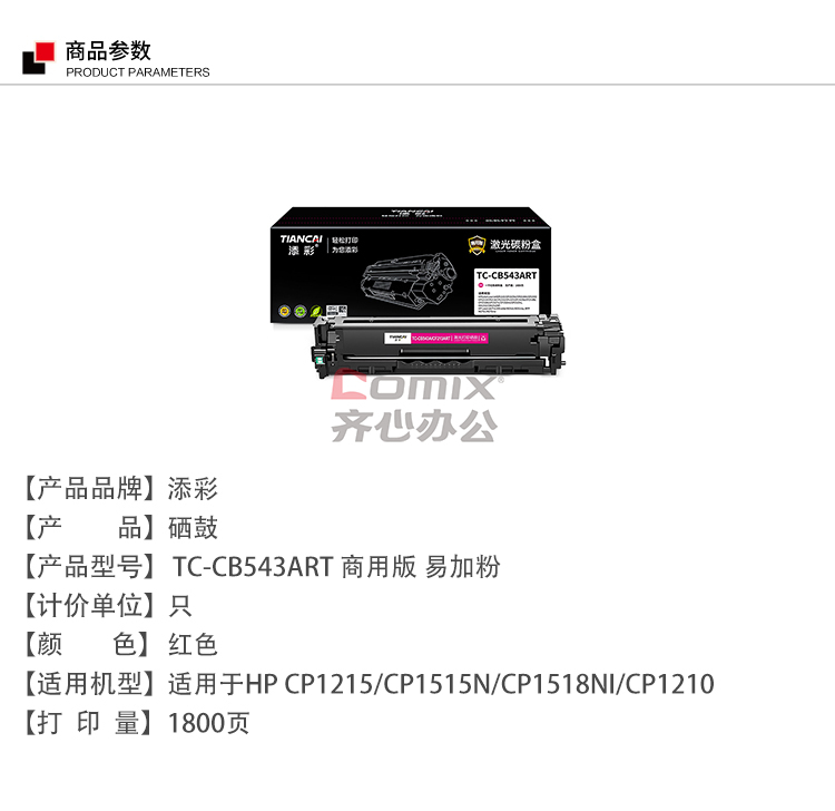 - 商品名称:添彩 商用版TC-CB543ART M 硒鼓 易加粉 1800页 适用机型:惠普HP CP1215/CP1515N/CP1518NI/CP1210 红色(计价单位:盒)