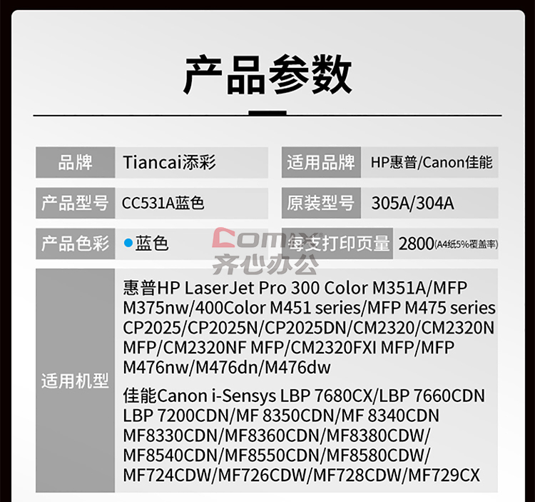 - 商品名称:添彩 商用版TC-CC531A C 硒鼓 2800页 适用机型:惠普HP Pro 300 Color M351A/MFP M375nw 蓝色 (计价单位:盒)