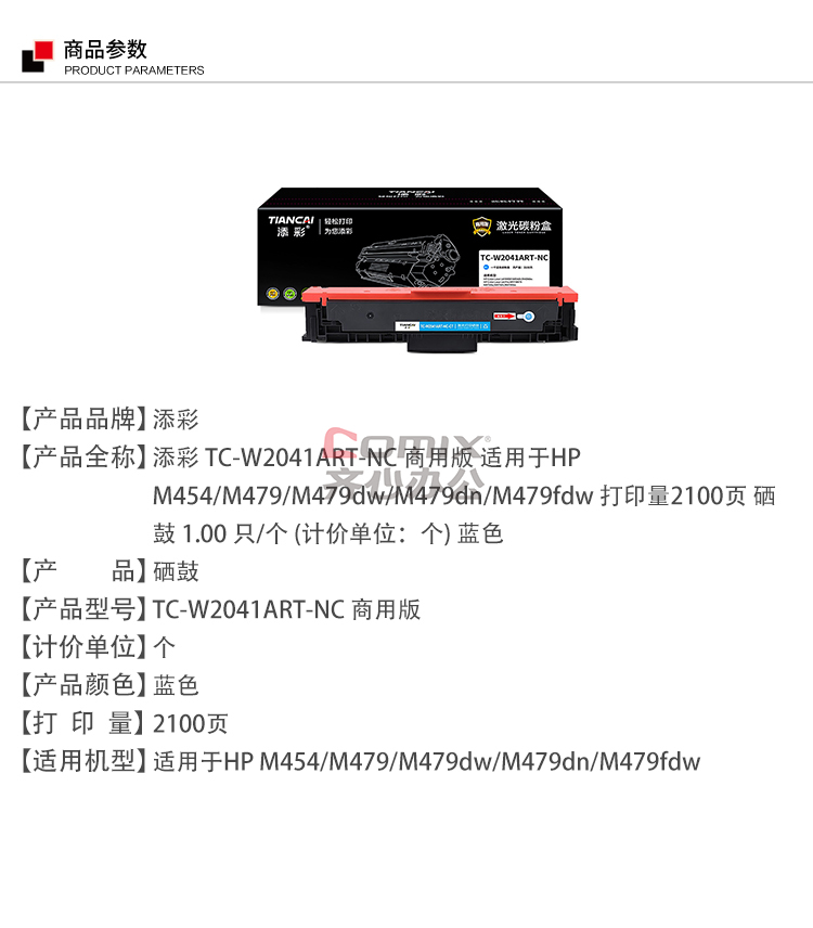 - 商品名称:添彩 商用版TC-W2041ART-NC 易加粉不带芯片 2100页 适用机型:惠普HP Color LaserJet M454 M454dn/M454dw. HP Color LaserJet Pro MFP M479 M479dw/M479dn/M479fdw打印机 硒鼓(计价单位:盒) 蓝色