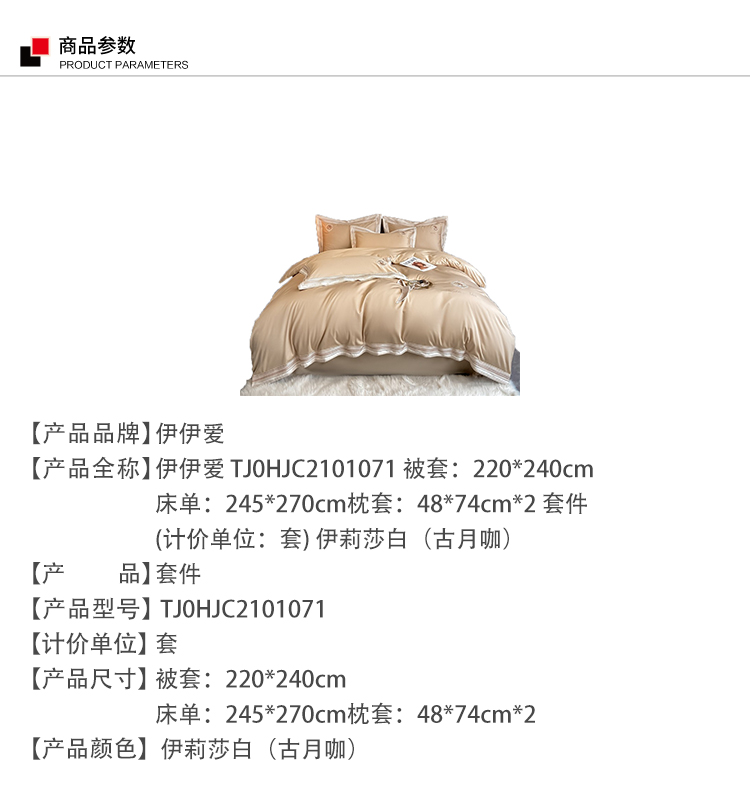 商品名称:伊伊爱TJ0HJC2101071伊丽莎白100S绣花四件套220*240cm古月咖(单位:套)