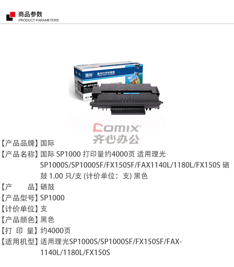 国际 SP1000 打印量约4000页 适用理光SP1000S/SP1000SF/FX150SF/FAX1140L/1180L/FX150S 硒鼓 1.00 只/支 (计价单位:支) 黑色