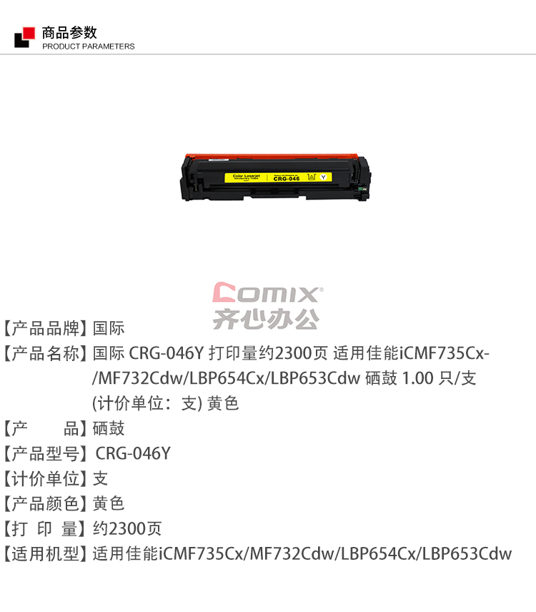 - 商品名称:国际 CRG-046Y 打印量约2300页 适用佳能iCMF735Cx/MF732Cdw/LBP654Cx/LBP653Cdw 硒鼓 1.00 只/支 (计价单位:支) 黄色