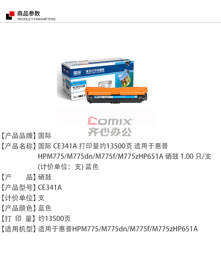 国际 CE341A 打印量约13500页 适用于惠普HPM775/M775dn/M775f/M775zHP651A 硒鼓 1.00 只/支 (计价单位:支) 蓝色