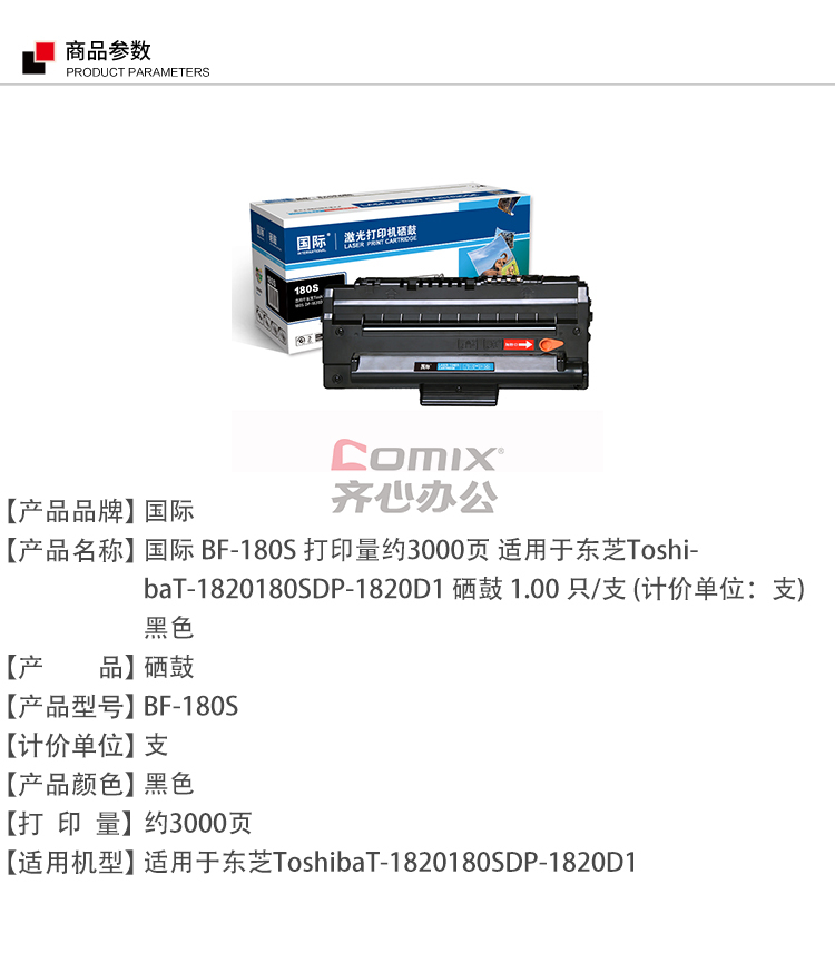 - 商品名称:国际 BF-180S 打印量约3000页 适用于东芝ToshibaT-1820180SDP-1820D1 硒鼓 1.00 只/支 (计价单位:支) 黑色