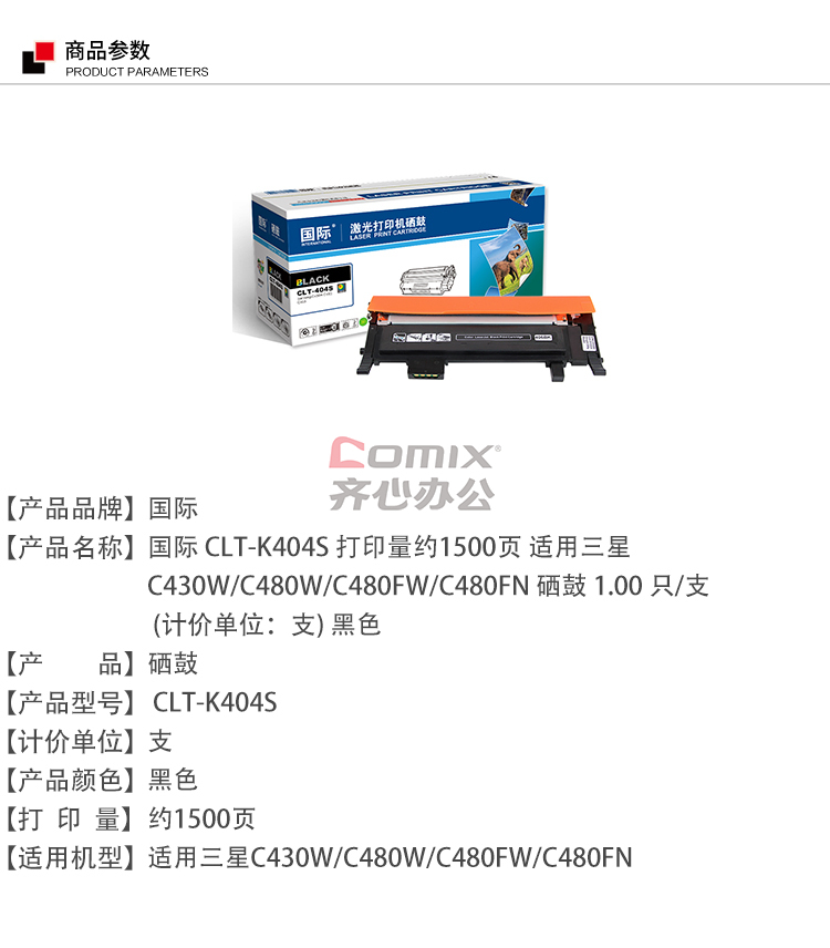 - 商品名称:国际 CLT-K404S 打印量约1500页 适用三星C430W/C480W/C480FW/C480FN 硒鼓 1.00 只/支 (计价单位:支) 黑色