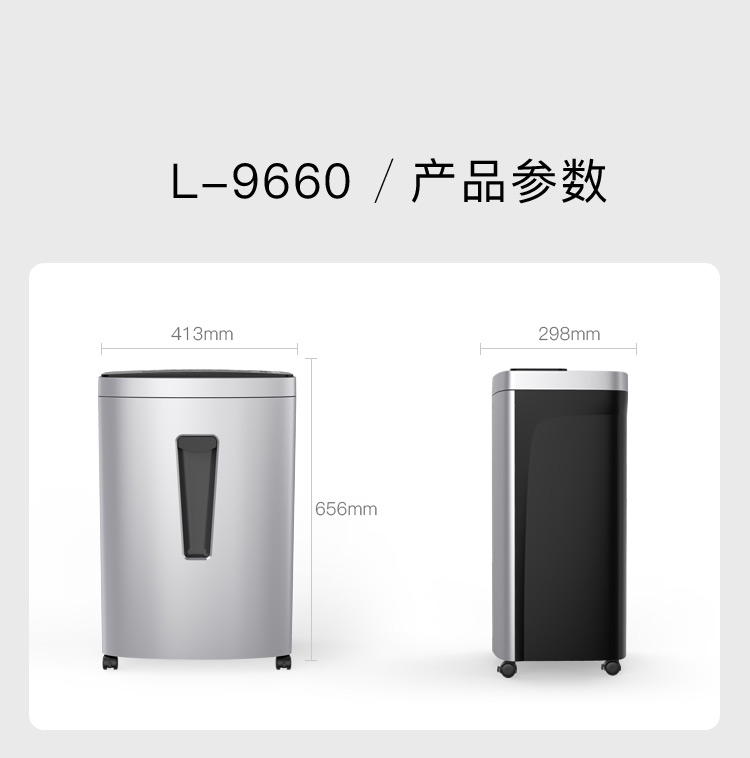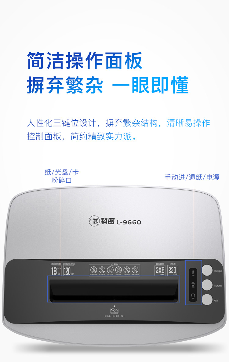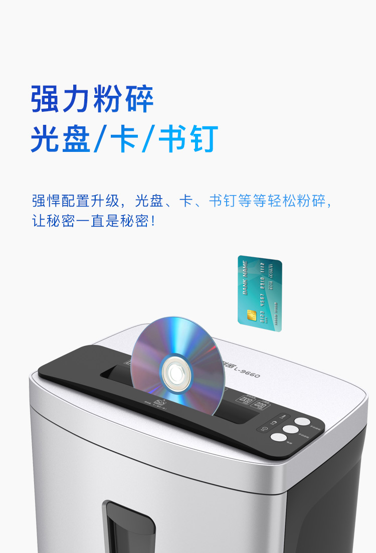 - 商品型号:L-9660 (单次18张 2*8mm 持续120分钟 36L 可碎卡、光盘、订书针)