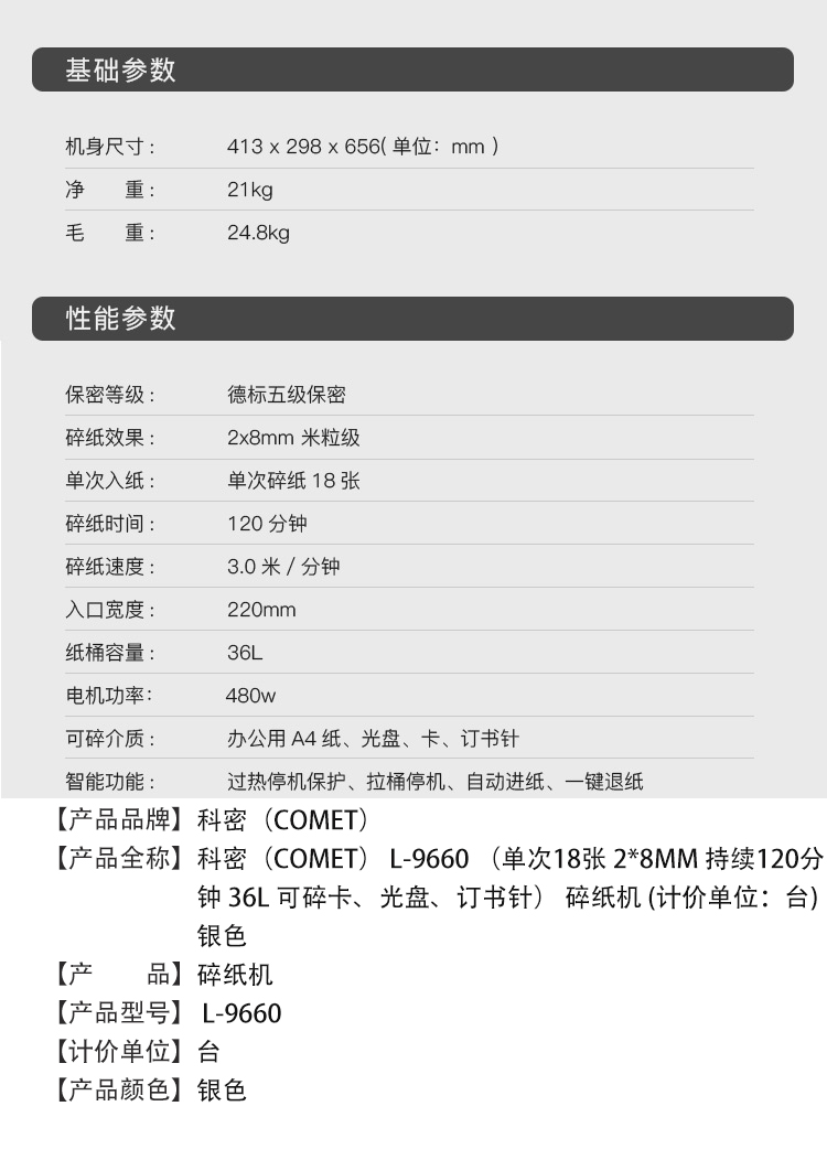 - 商品名称:科密(Comet) L-9660 (单次18张 2*8mm 持续120分钟 36L 可碎卡、光盘、订书针) 碎纸机 (计价单位:台)