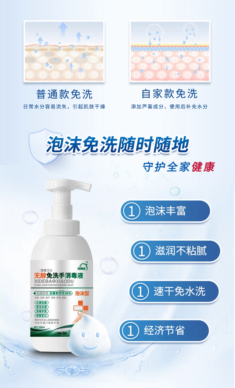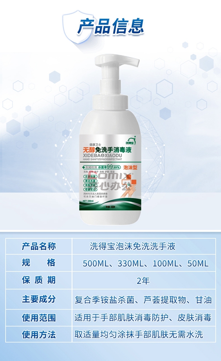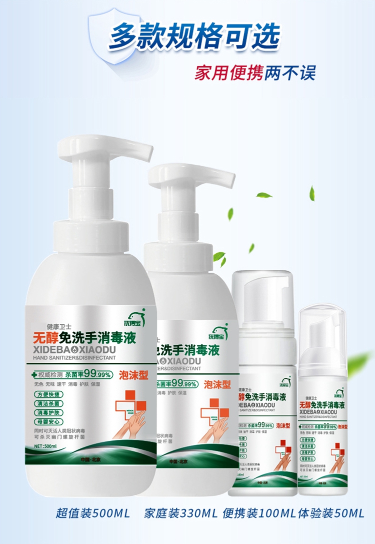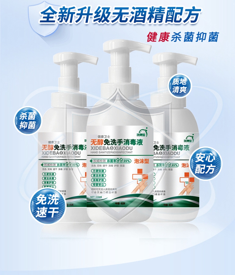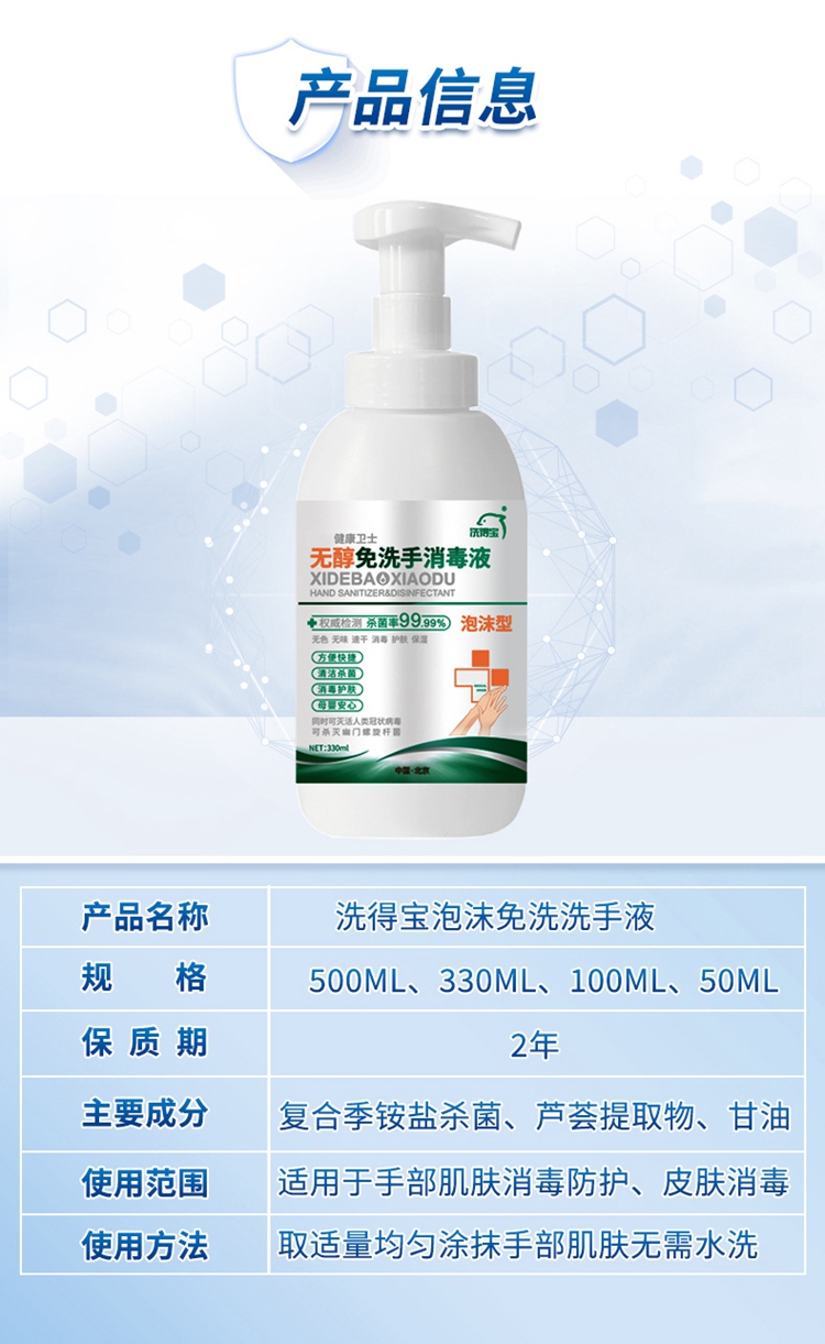 商品名称:洗得宝 不含酒精免洗手 消毒液 泡沫手消 家庭装 330ml 蓝(单位:瓶)
