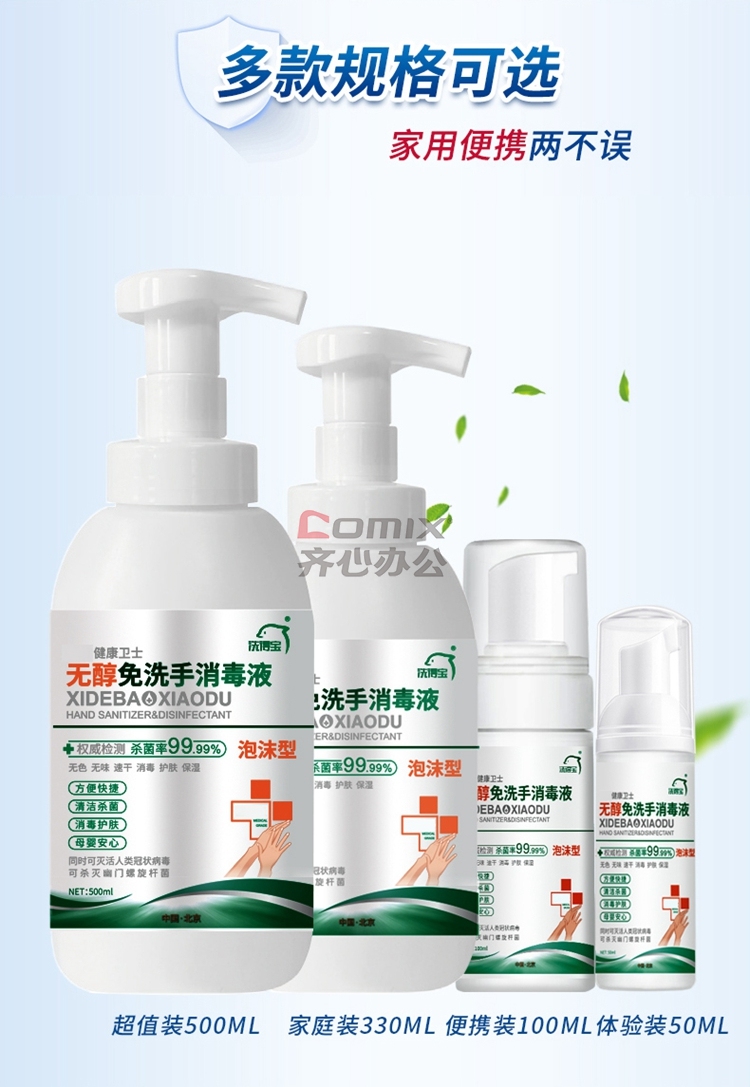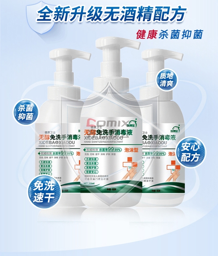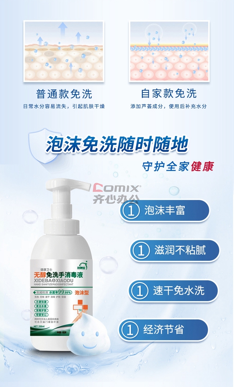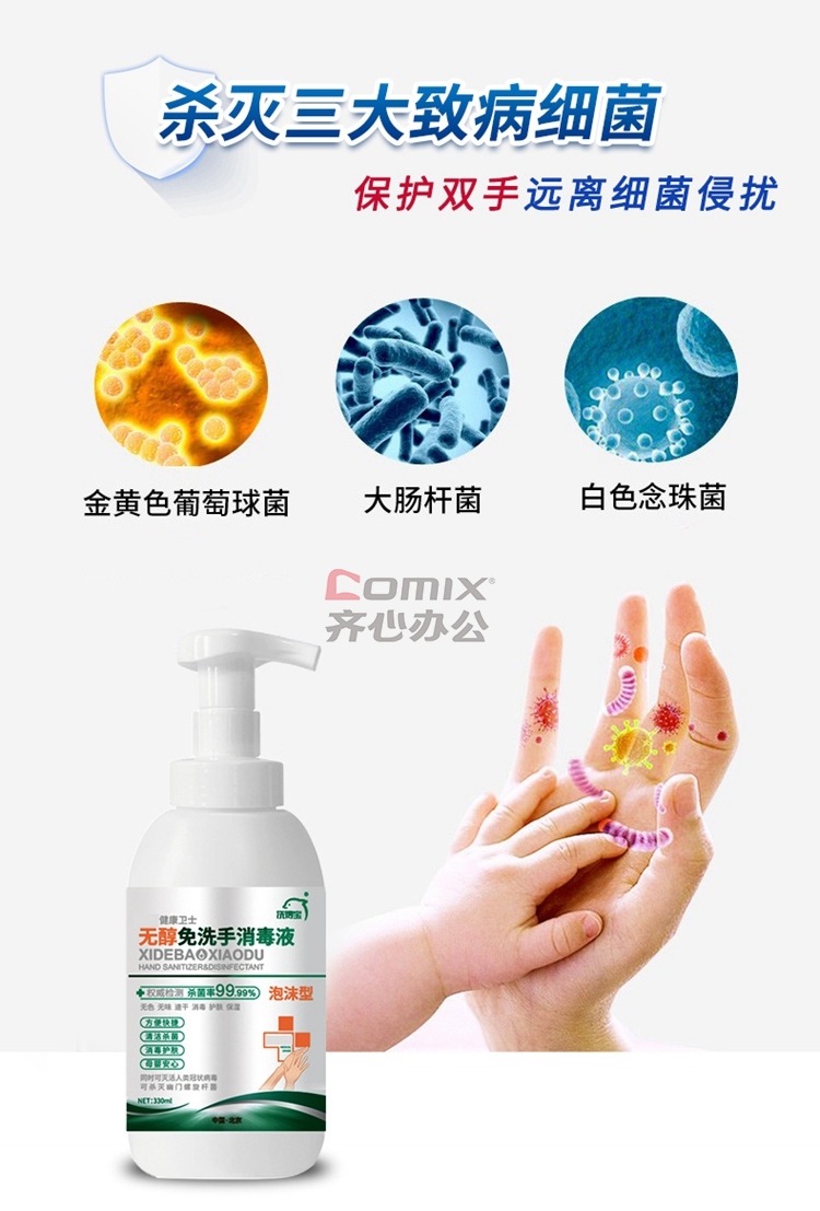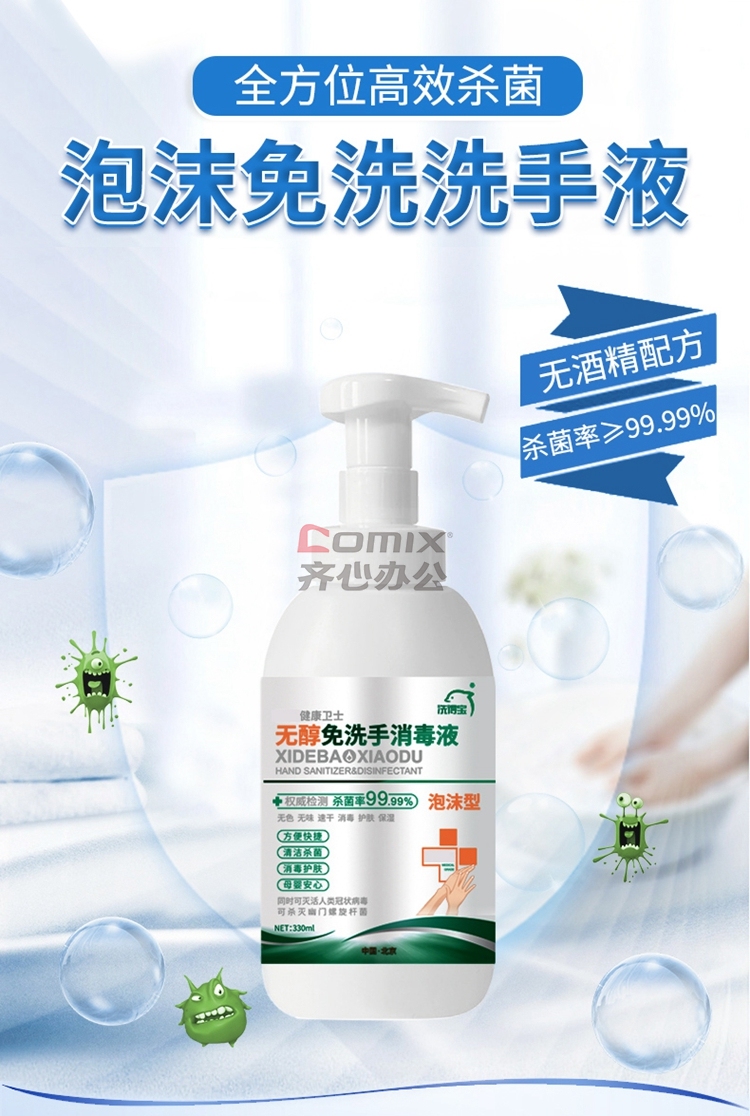 商品名称:洗得宝 不含酒精免洗手 消毒液 泡沫手消 家庭装 330ml 蓝(单位:瓶)