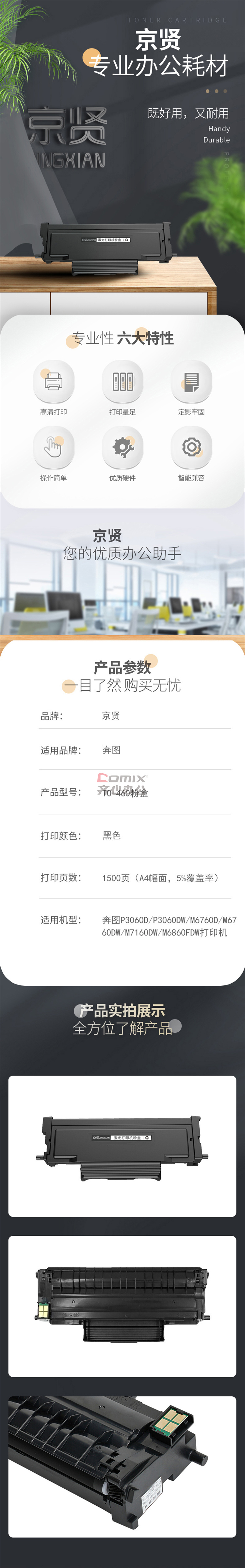 - 商品名称:京贤 TO-460粉盒 黑色 适用奔图P3060D/P3060DW/M6760D/M6760DW/M7160DW/M6860FDW打印机(单位:支)