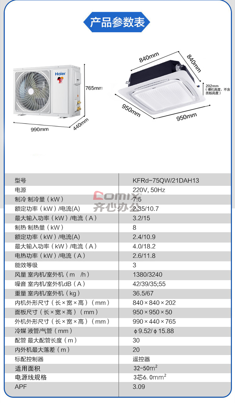 商品名称:海尔 KFRd-75QW/21DAH13 天花嵌入式3匹空调 三级能效 白色(单位:套)