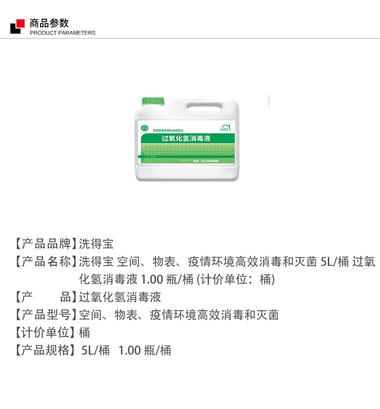 商品名称:洗得宝空间、物表、疫情环境高效消毒和灭菌5L/桶过氧化氢消毒液1.00瓶/桶(计价单位:桶)
