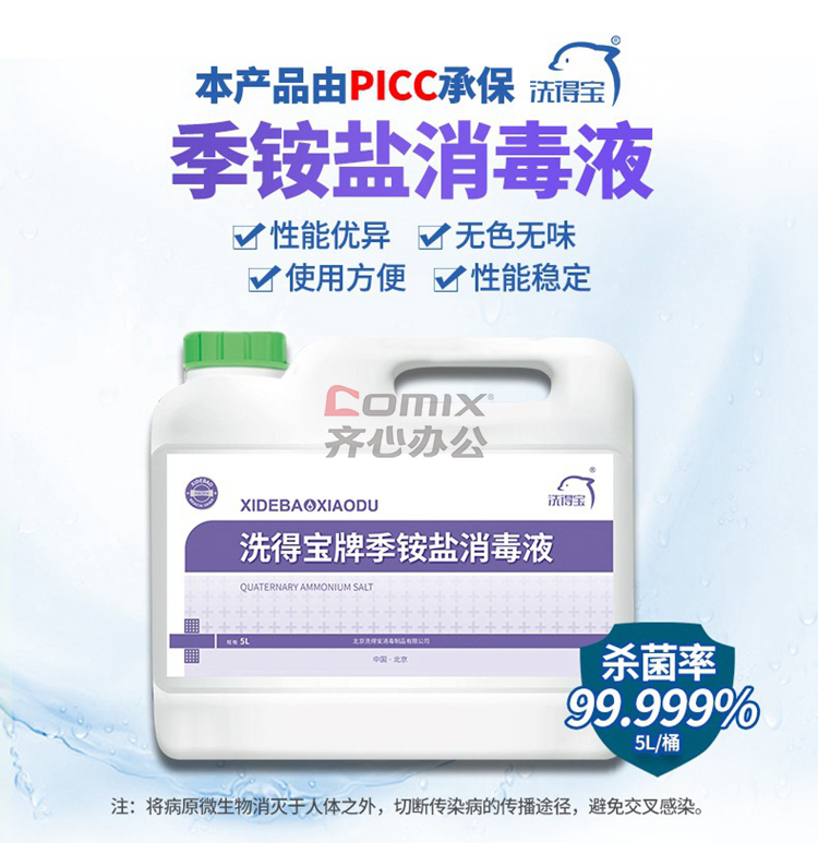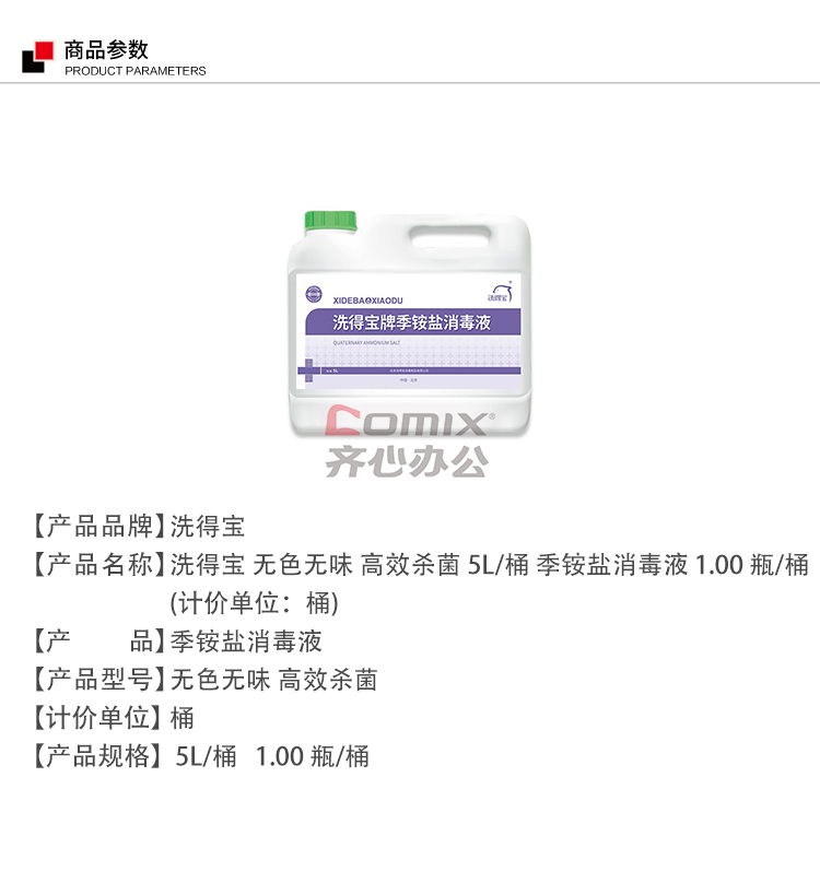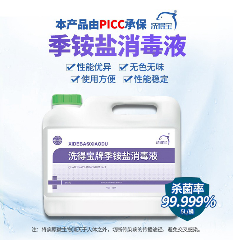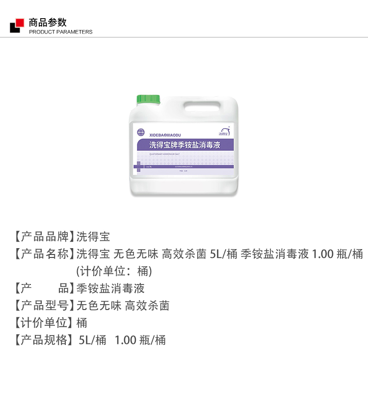 商品名称:洗得宝无色无味高效杀菌5L/桶季铵盐消毒液1.00瓶/桶(计价单位:桶)