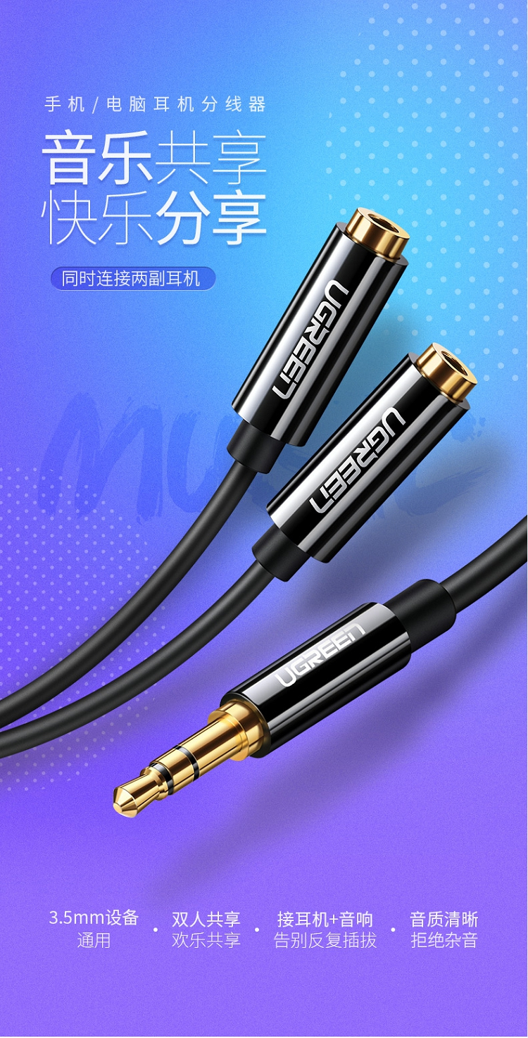绿联 20816 UGREEN 音频线 3.5mm一分二公对母 AUX分线器 手机平板音响转接连接线延长器(单位:条)黑