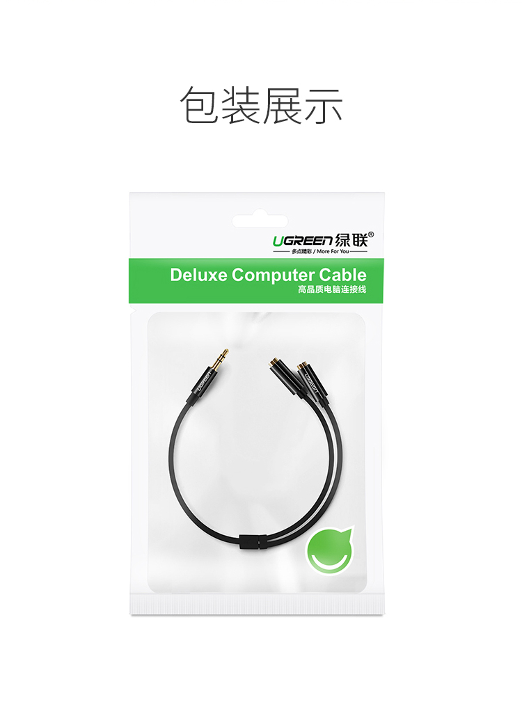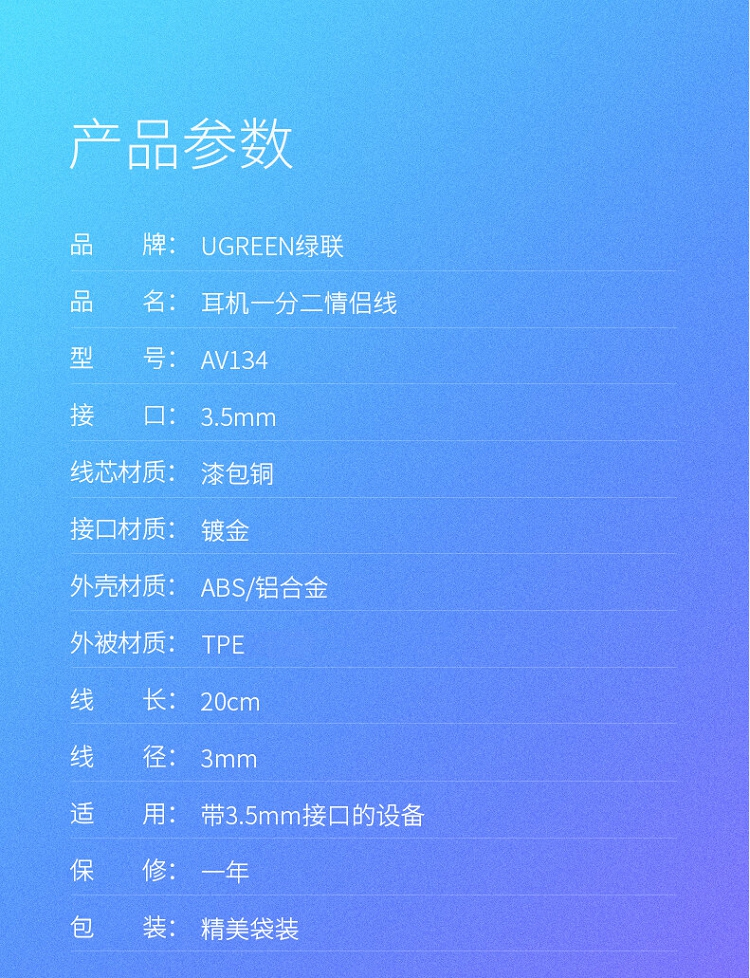 - 商品名称:绿联 20816 UGREEN 音频线 3.5mm一分二公对母 AUX分线器 手机平板音响转接连接线延长器(单位:条)黑