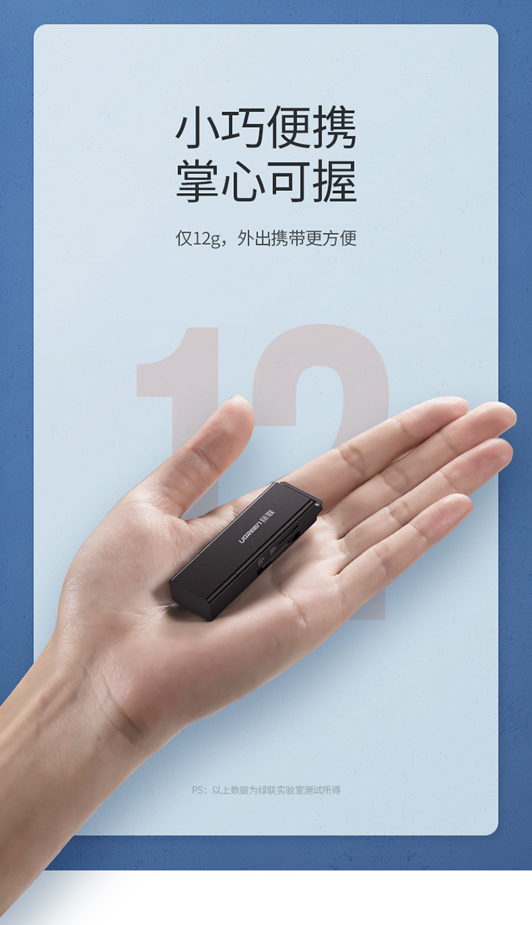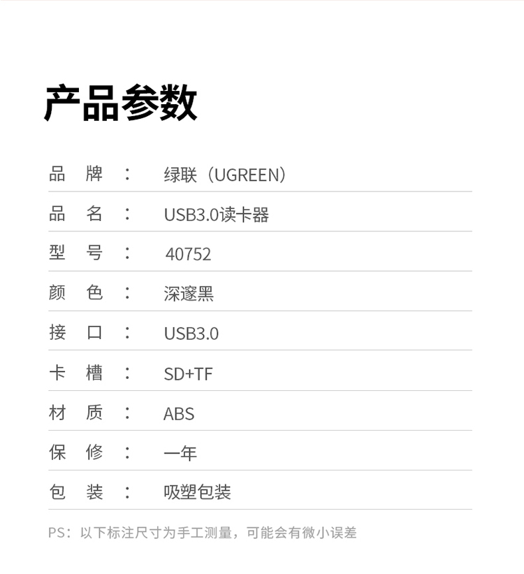 商品名称:绿联(UGREEN) 40752 USB3.0读卡器 SD/TF二合一 黑色 单位:个