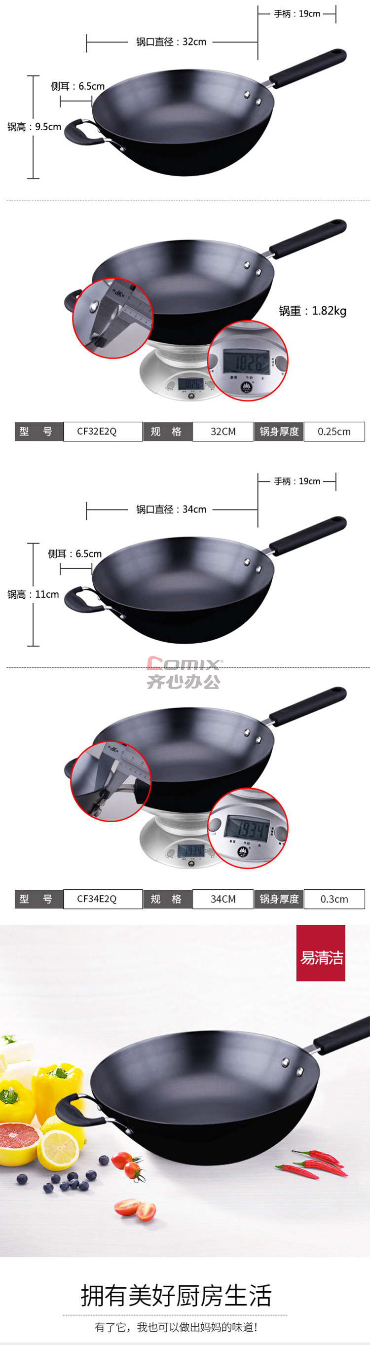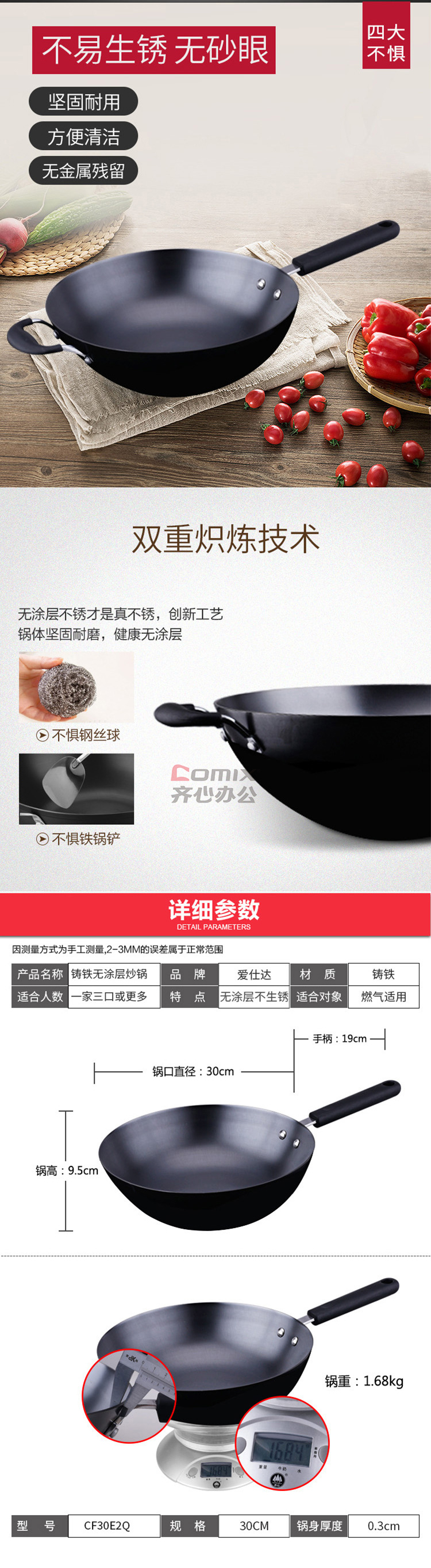 商品名称:爱仕达 CF34E2Q 34cm 不易锈铸铁无涂层炒锅 单位:口