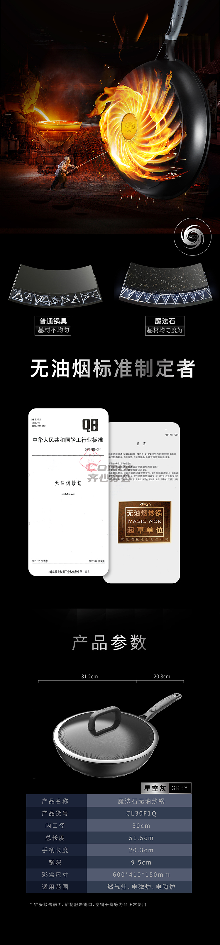 商品名称:爱仕达 CL30F1Q 30cm 魔法石无油烟炒锅 单位:口