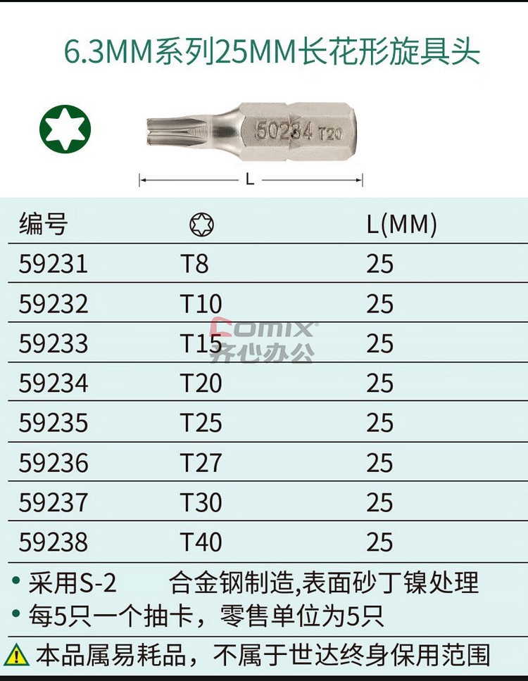 商品名称:世达/SATA 59331 5件套6.3MM系列50MM长花形旋具头T8 (单位:套)