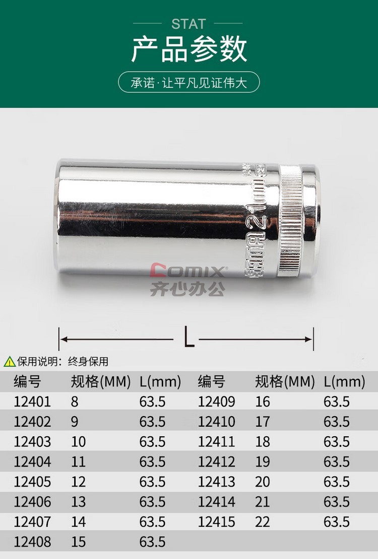 商品名称:世达/SATA 12412 10MM系列6角长套筒19MM (单位:个)