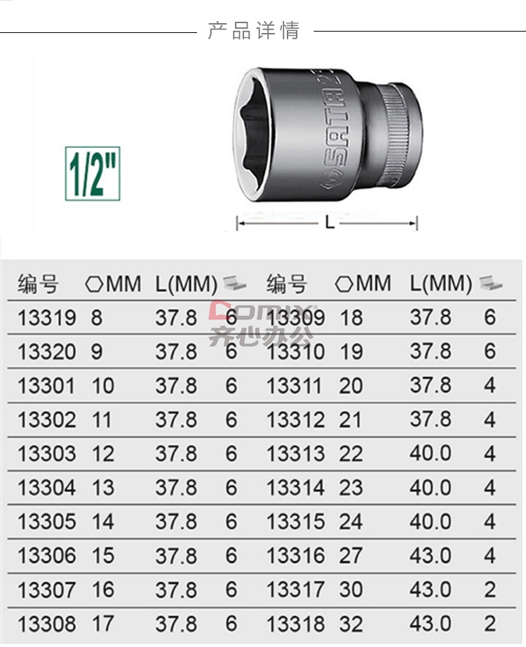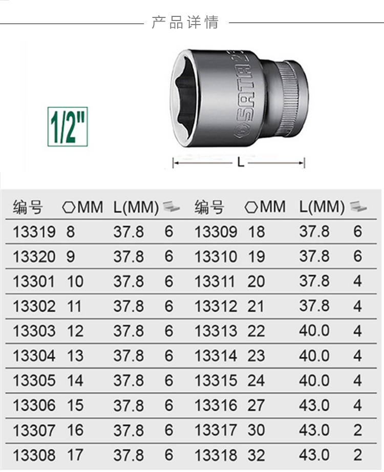 商品名称:世达/SATA 13319 12.5MM系列6角套筒8MM (单位:个)