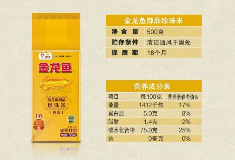 商品名称:金龙鱼 御品珍珠米 500g(单位:袋)真空包装