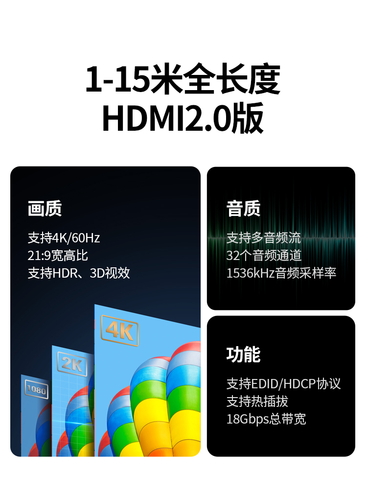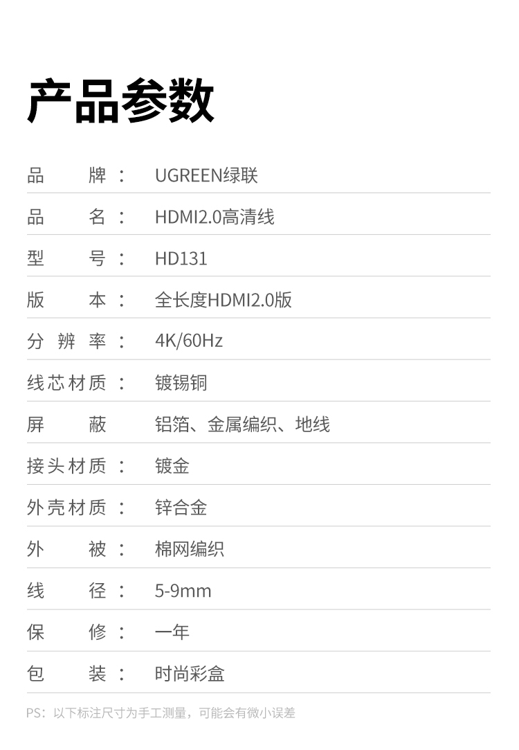 商品名称:绿联(UGREEN) 50109 HDMI数字高清线2.0版4K60Hz 3米 1 根