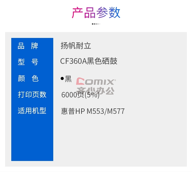 - 商品名称:扬帆耐立 兼容CF360A硒鼓(鼓粉一体)商专版带芯片黑色 单支装(适用惠普HP M553 M577) 打印页数:6000