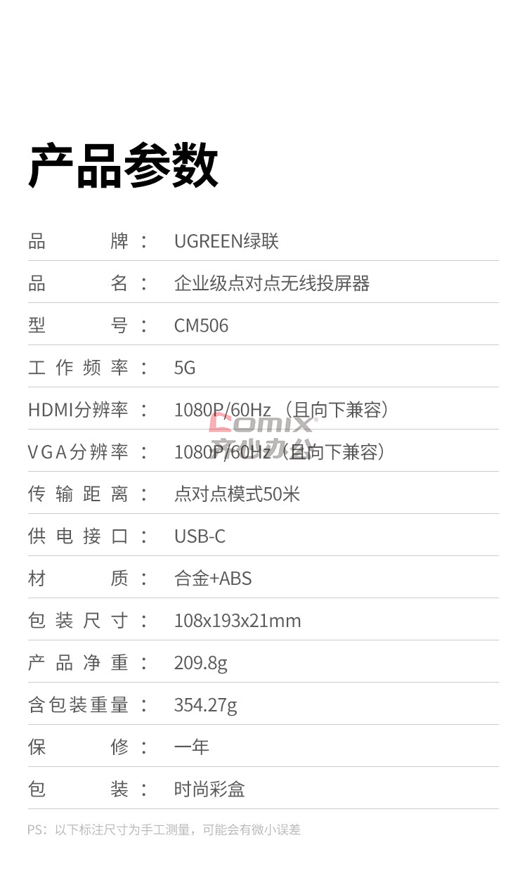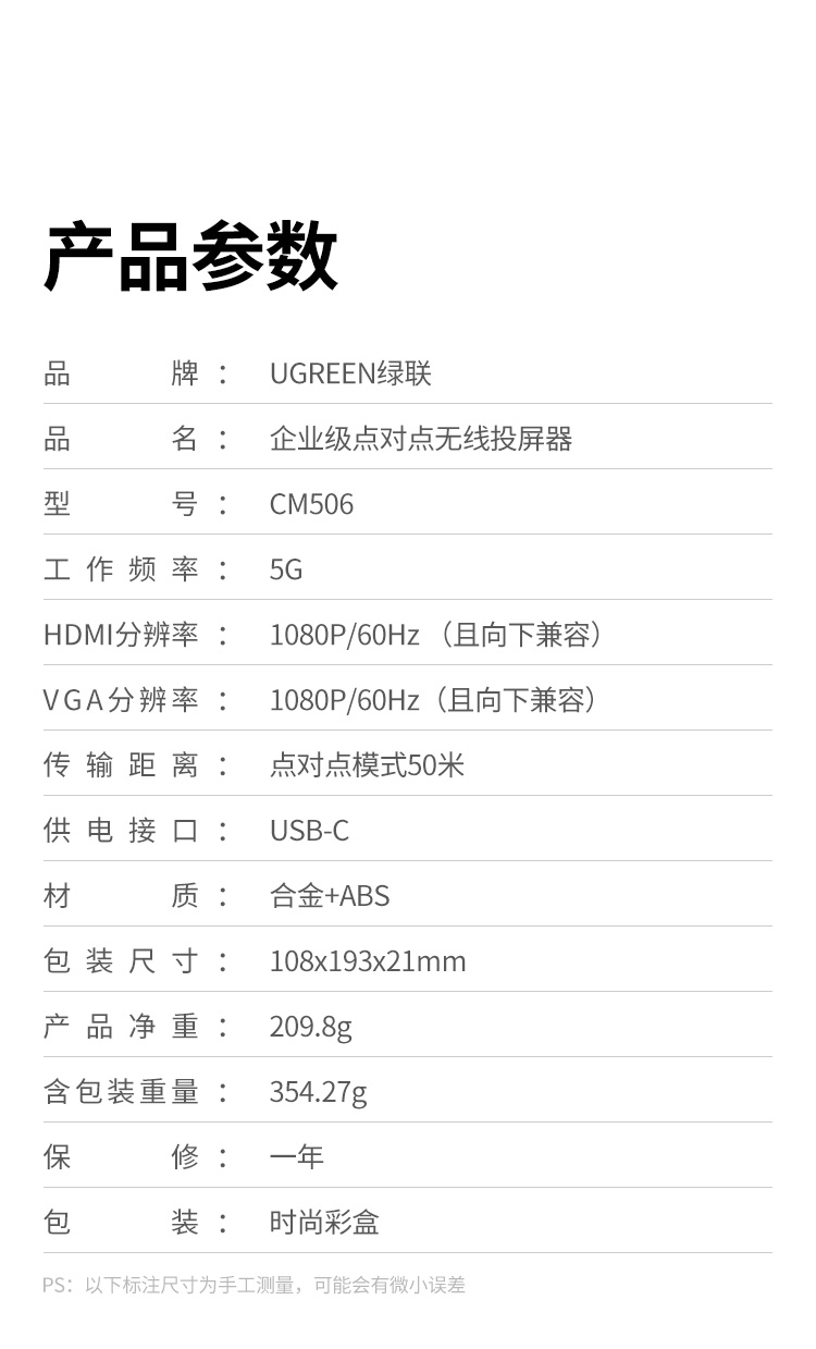 - 商品名称:绿联 50633 HDMI无线投屏器 高清办公会议家用同屏器 适用笔记本电脑台式机连接电视显示器投影仪 50米传输器 单位:个