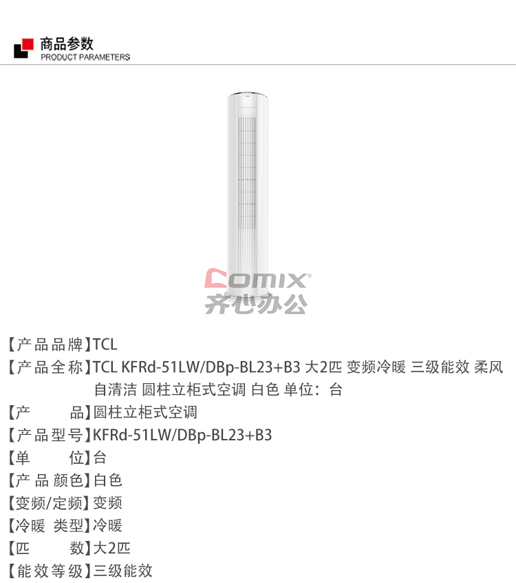 - 商品名称:TCL KFRd-51LW/DBp-BL23+B3 大2匹圆柱空调 变频3级能效 白色(单位:套)