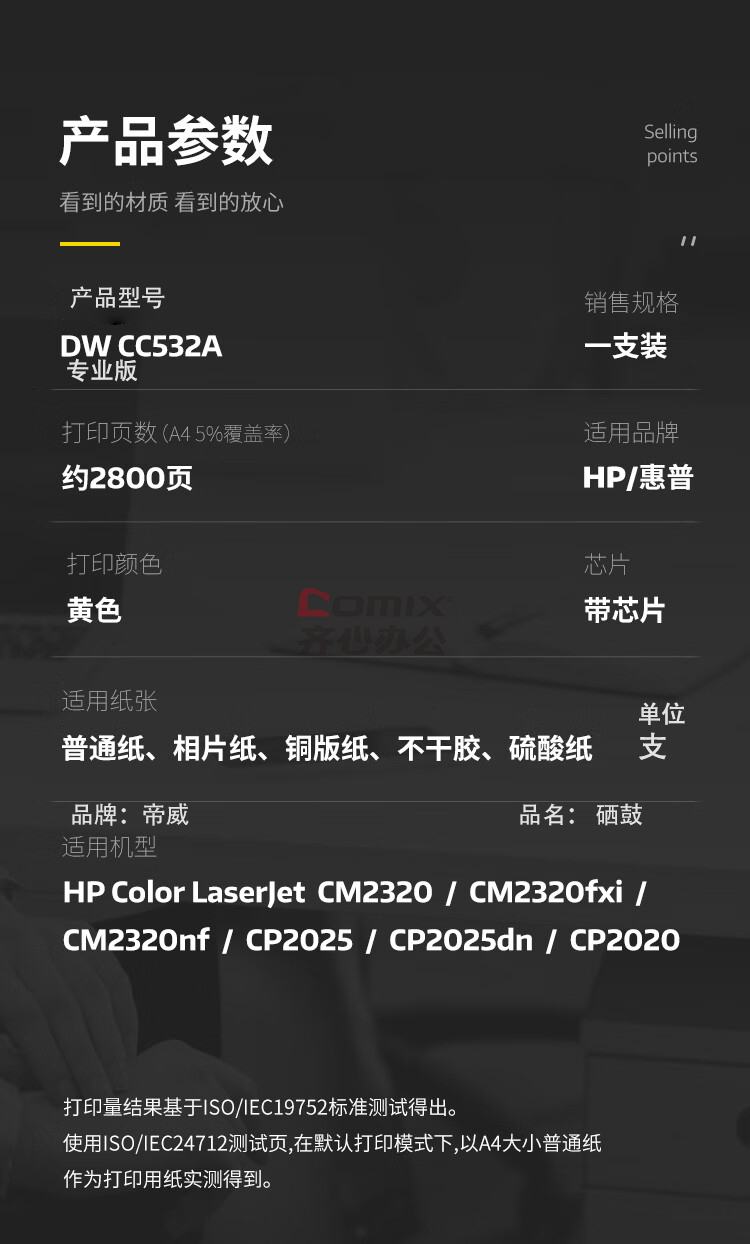- 商品名称:帝威 DW CC532A 硒鼓(带芯片) 专业版 适用惠普HPColorLaserJetCP2025/CP2025dn 打印量2800页 黄色 单位:支
