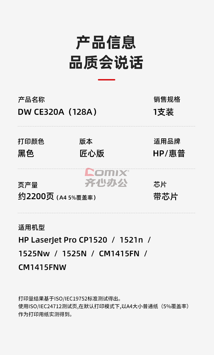 - 商品名称:帝威 DW CE320A(128A) 硒鼓(带芯片) 匠心版 适用惠普HPCP1520/1521n/1525N/CM1415FN 打印量2200页 黑色 单位:支