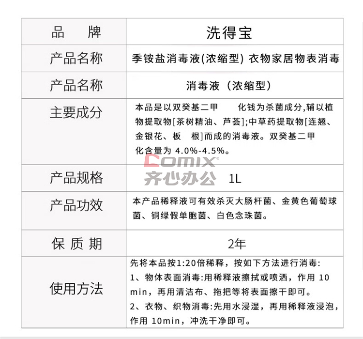 商品名称:洗得宝 1L/瓶 衣物消毒液(浓缩型)衣物家居物表消毒 白 单位:瓶