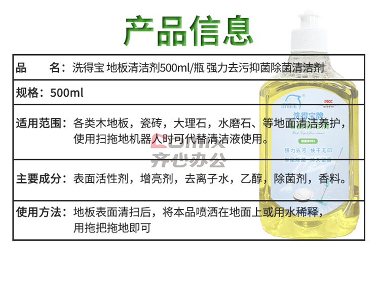 商品名称:洗得宝 500ml/瓶 地板清洁剂 强力去污抑菌除菌清洁剂 单位:瓶