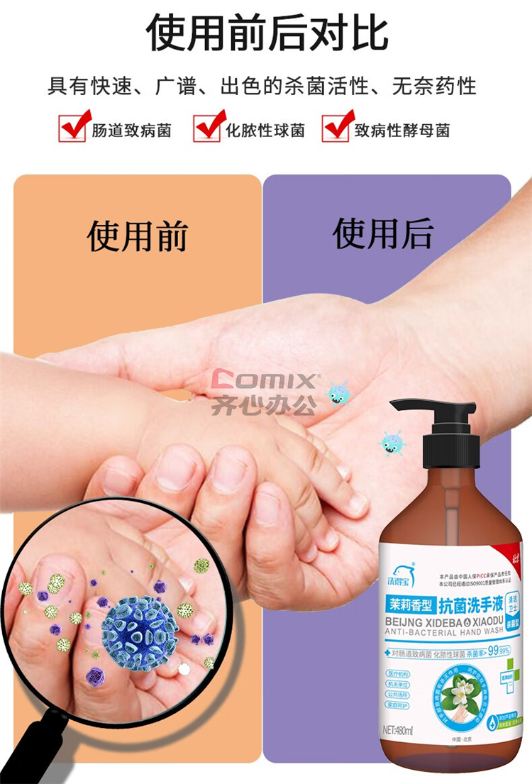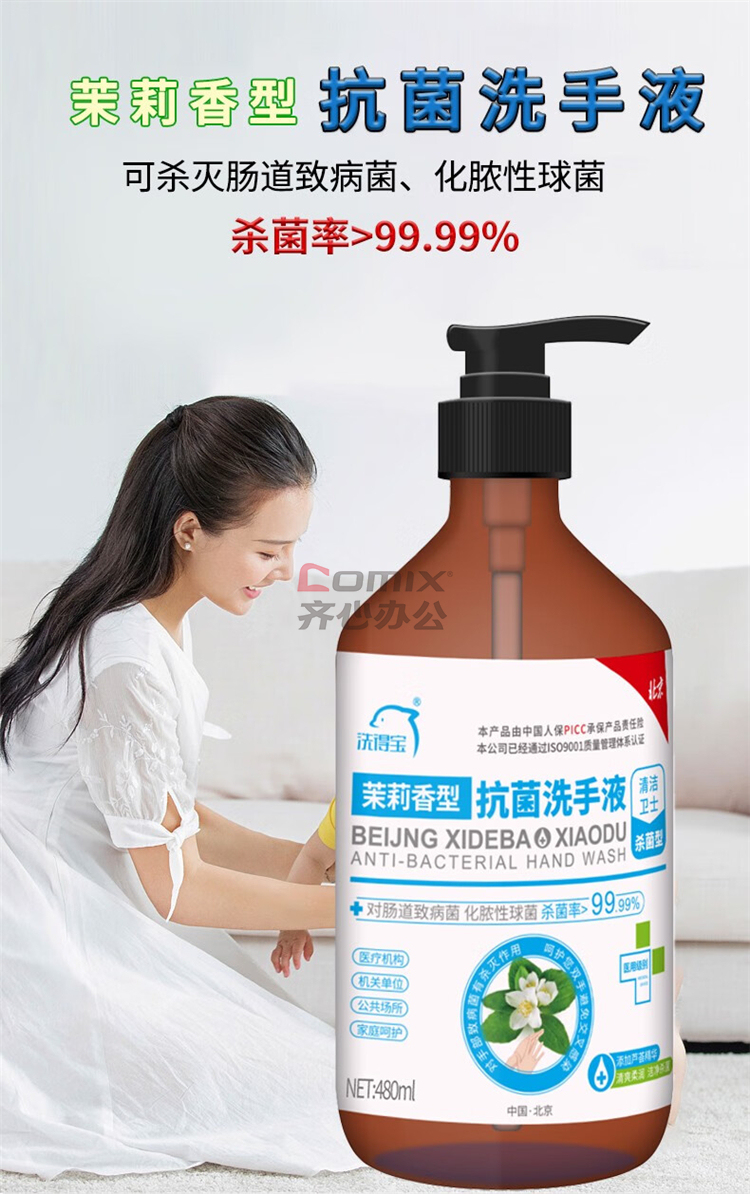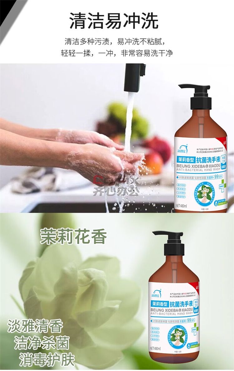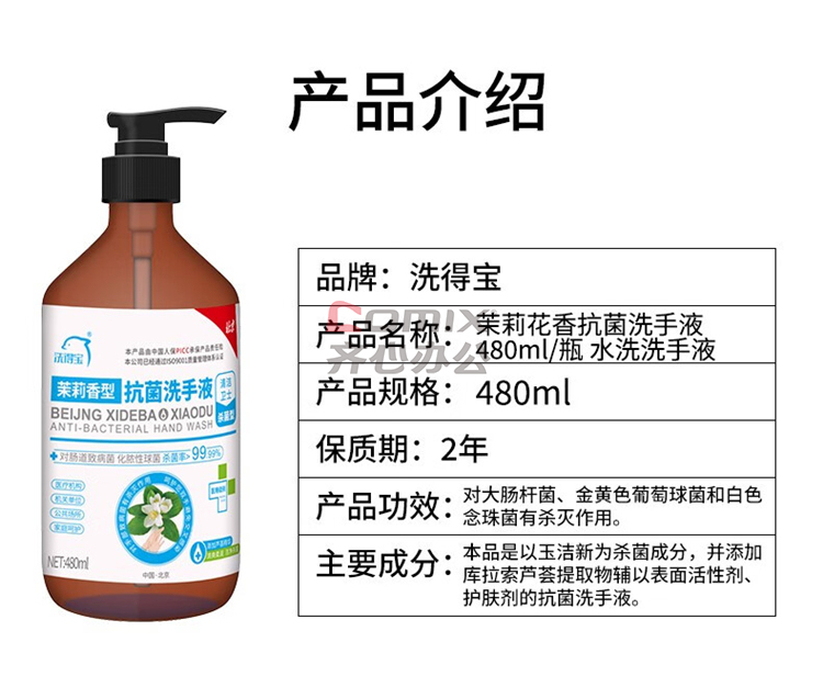 商品名称:洗得宝 480ml/瓶 茉莉花香抗菌洗手液 水洗洗手液 单位:瓶