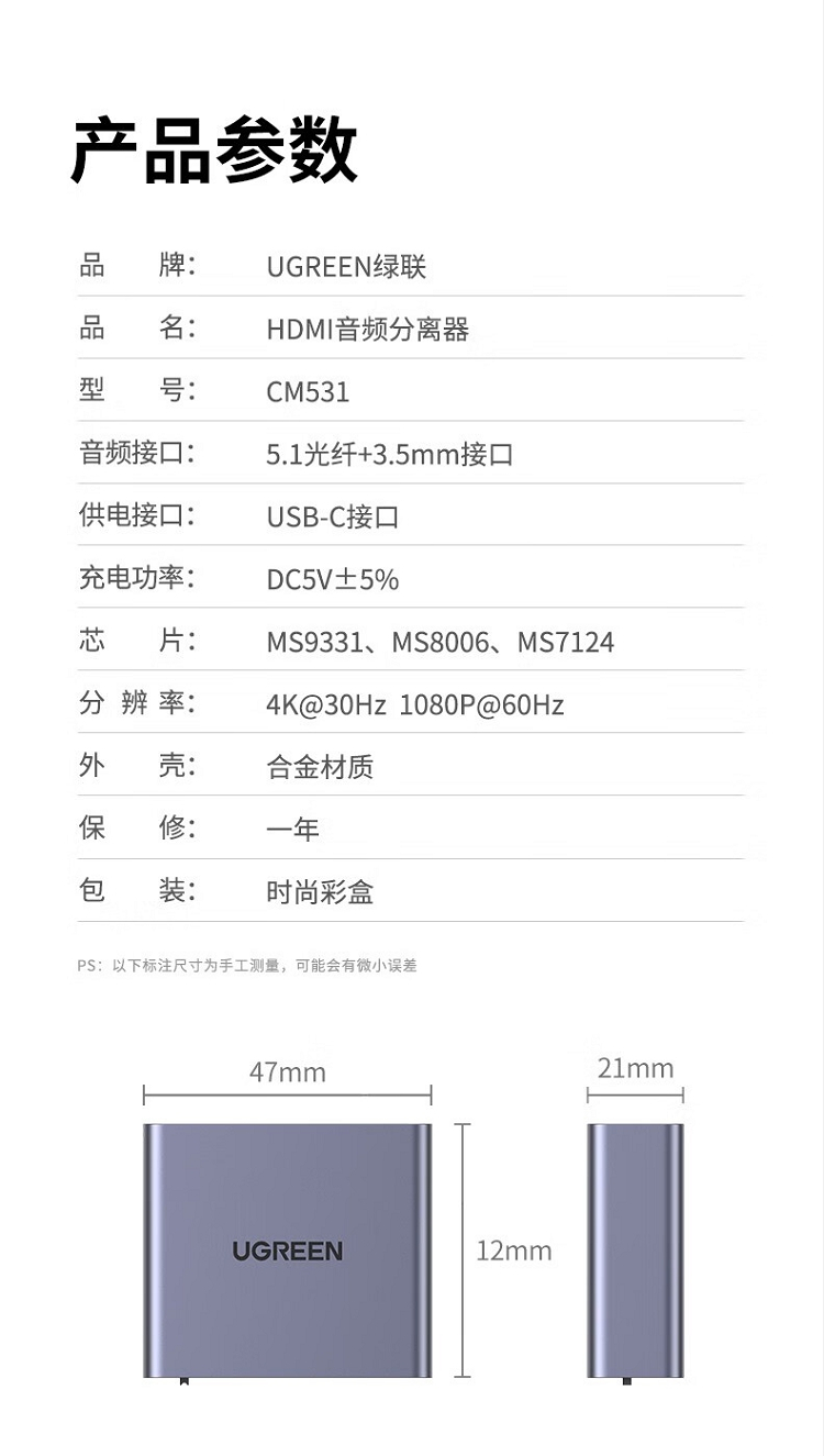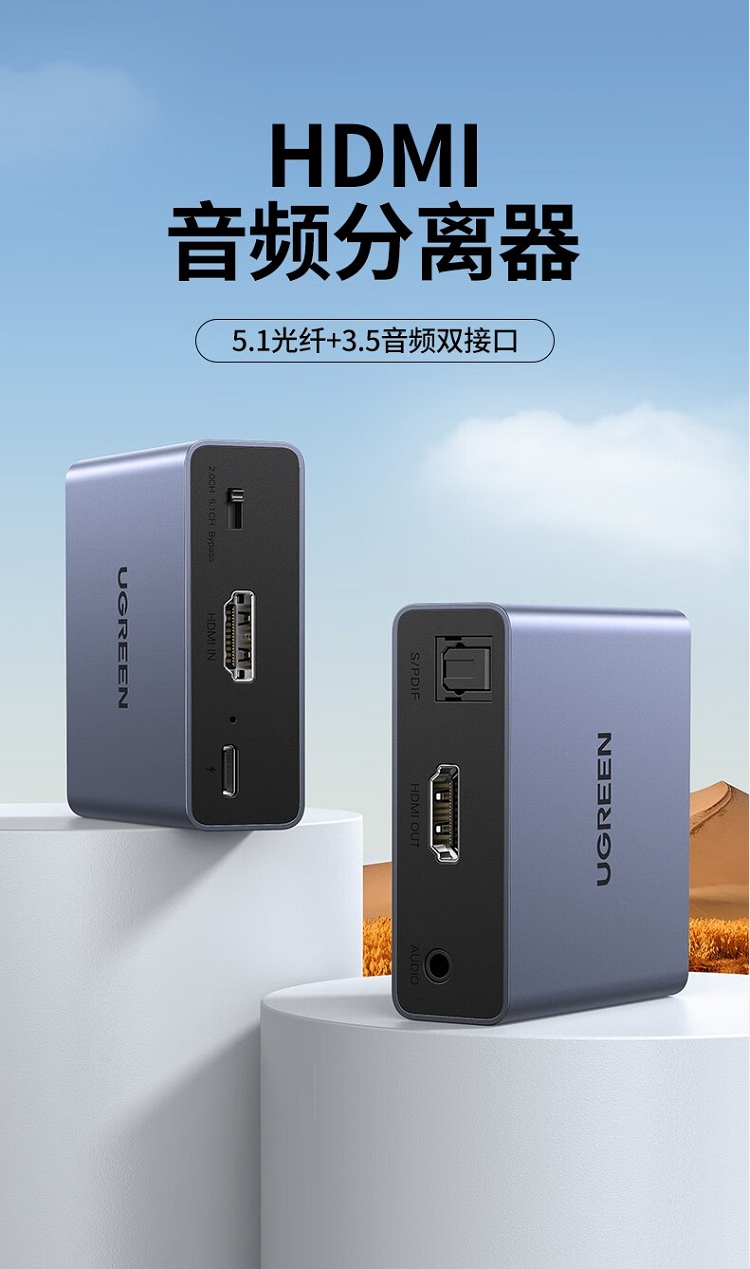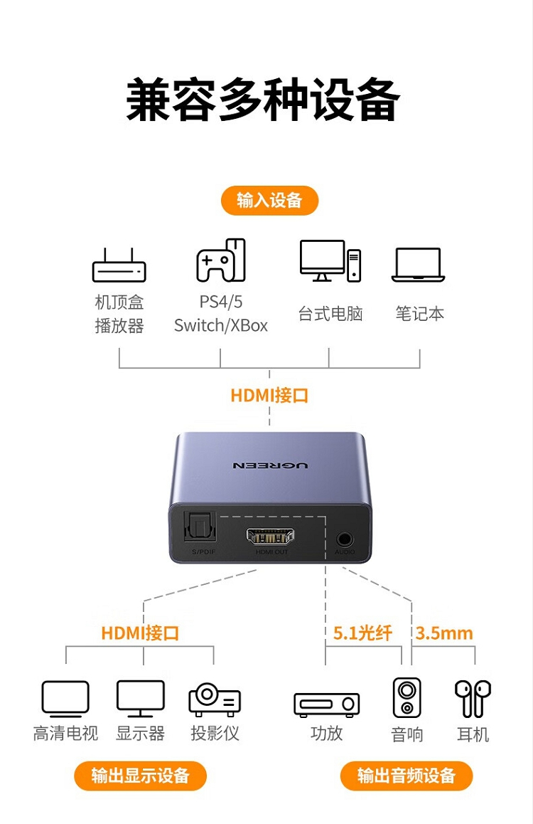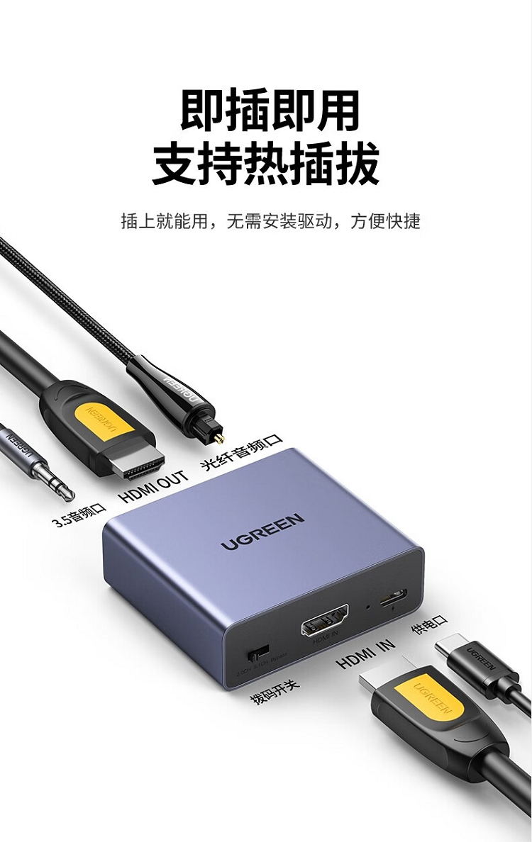 商品名称:绿联 60649 适用视频投影笔记本计算机机顶盒 HDMI音频分离器 黑 单位:个