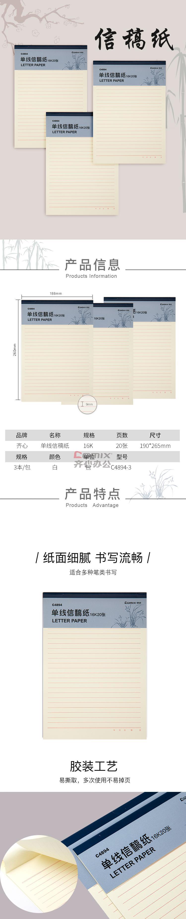 商品名称:齐心 C4894-3 单线信稿纸 16K 白色 3本/套 单位:套