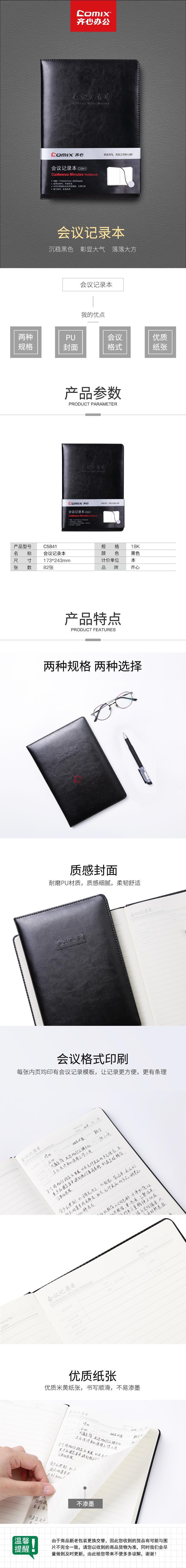 商品名称:齐心 C5841 会议记录本 18K 80张 黑色 单位:本
