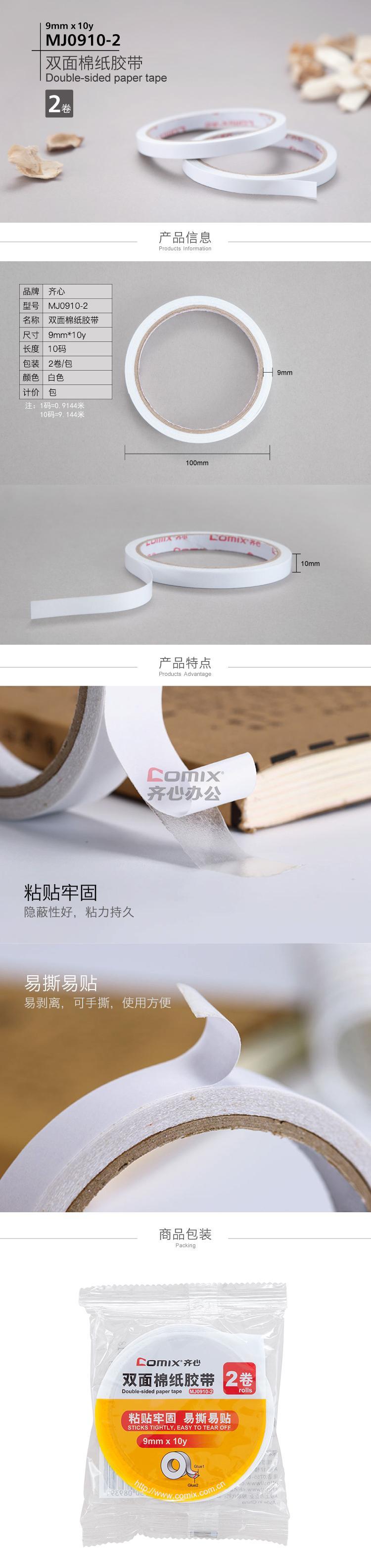 商品名称:齐心 MJ0910-2 双面棉纸胶带 9mm*10y 白色 2卷/袋 单位:袋