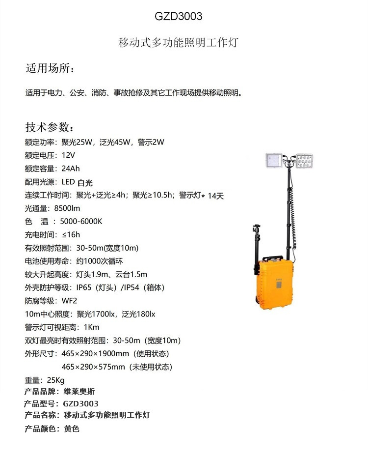 维莱奥斯 GZD3003 2W/25W/45W 5000-6000K IP65灯头IP54箱体 警示灯*14天/聚光≥10.5h/聚光+泛光≥4h 12V 白光LED 移动式多功能照明工作灯 (计价单位:台) 黄色