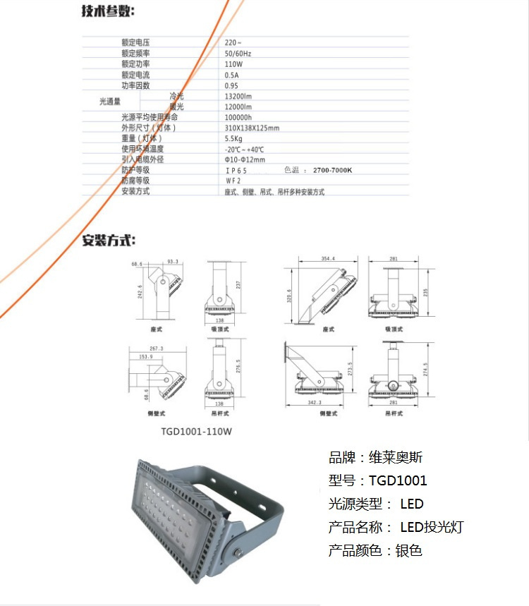 - 商品名称:维莱奥斯 TGD1001 110W 2700-7000K IP65 WF2 220V LED LED投光灯 (计价单位:个) 银色
