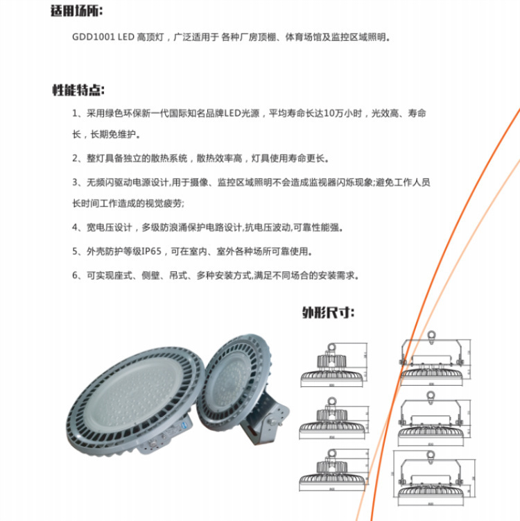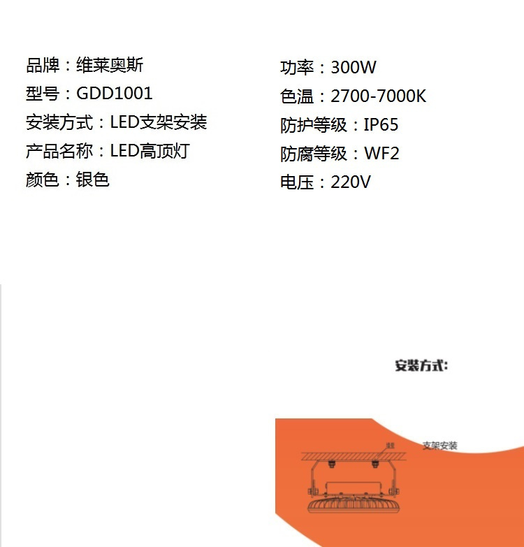 - 商品名称:维莱奥斯 GDD1001 300W 2700-7000K IP65 WF2 220V LED支架安装 LED高顶灯 (计价单位:个) 银色