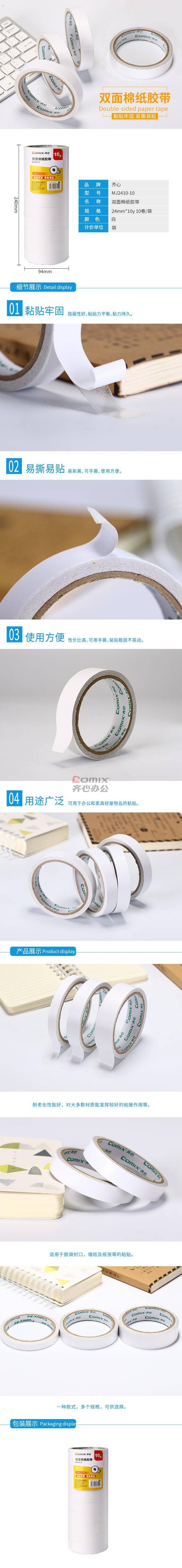 商品名称:齐心 MJ2410-10 双面棉纸胶带 24mm*10y 白色 10卷/筒 单位:筒