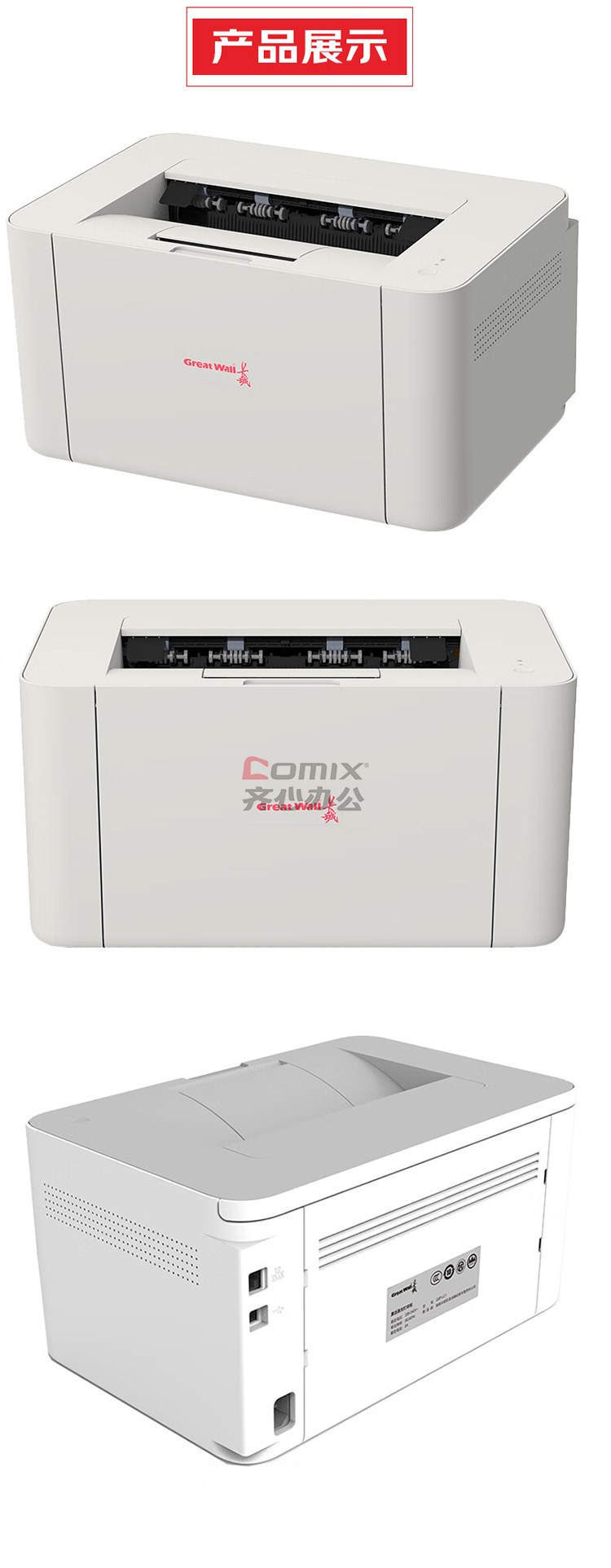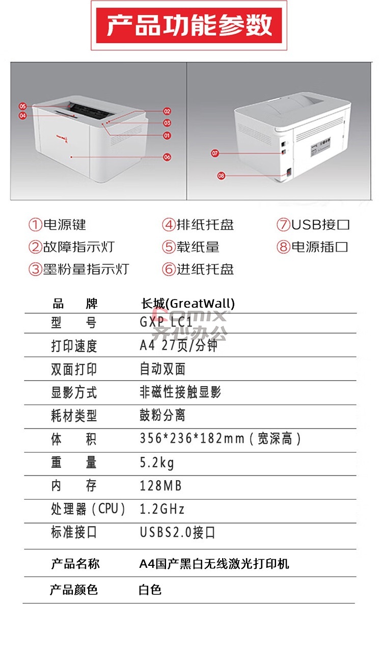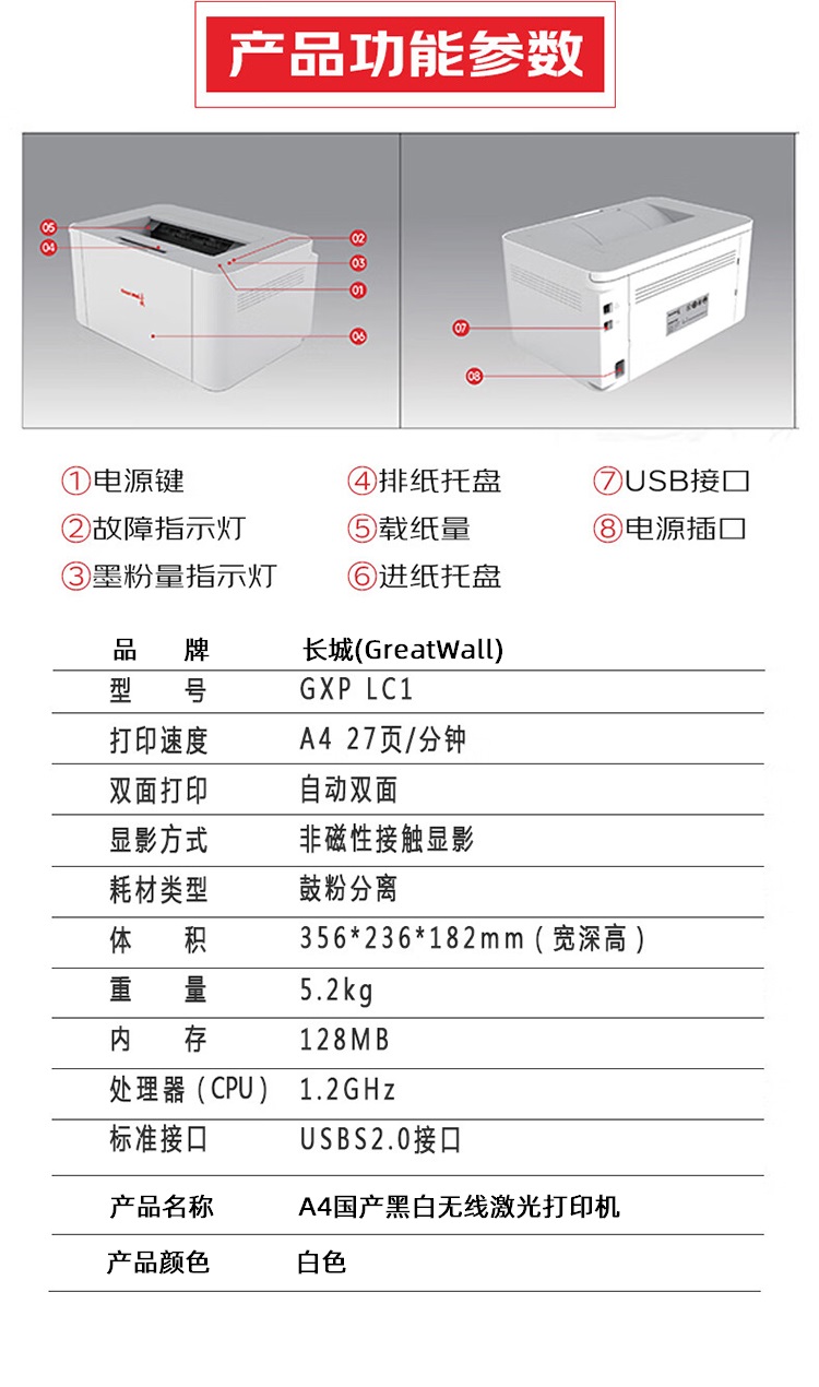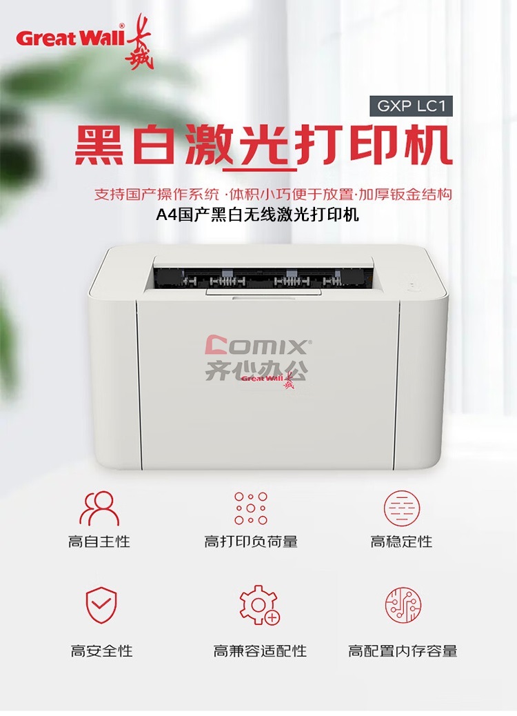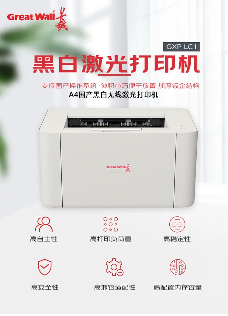 商品名称:长城(GreatWall) GXP-LC1 A4国产黑白无线激光打印机 白色 单位:台