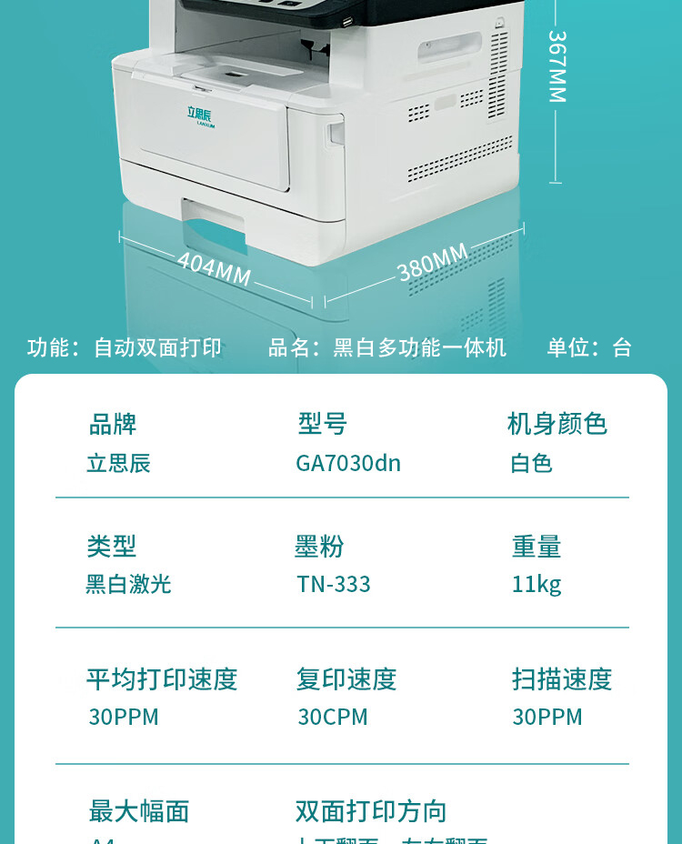 商品名称:立思辰(LANXUM) GA7030dn 自动双面打印 A4黑白多功能一体机 白色 单位:台