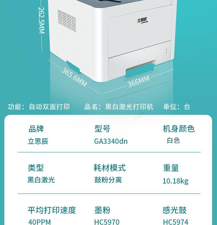 商品名称:立思辰(LANXUM) GA3340dn 自动双面打印 A4黑白激光打印机 白色 单位:台