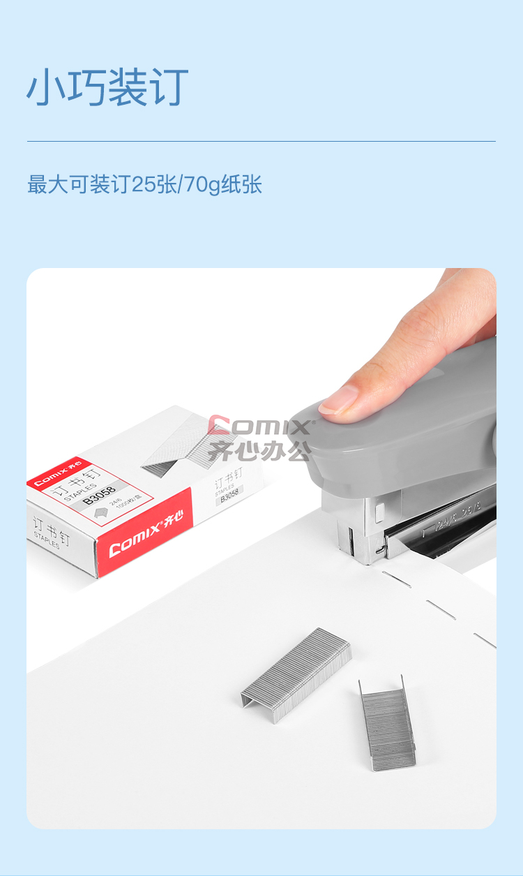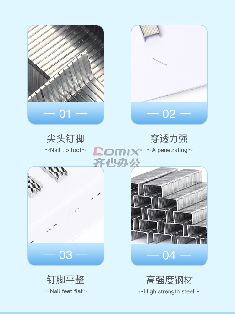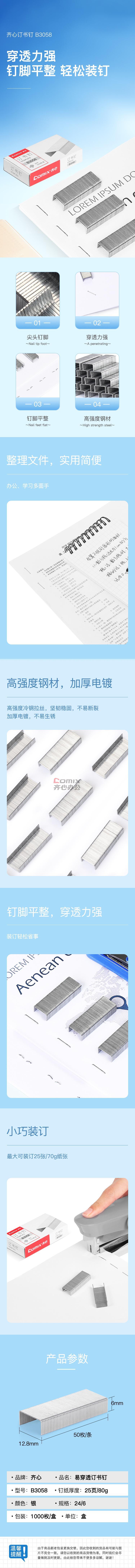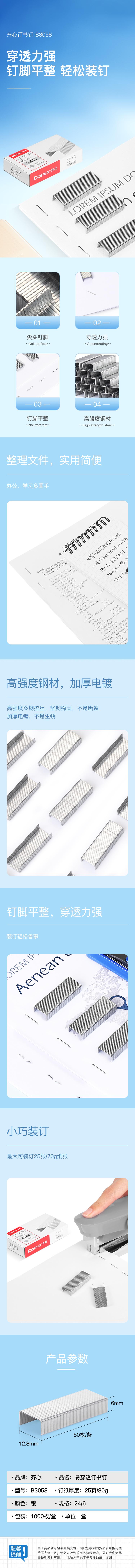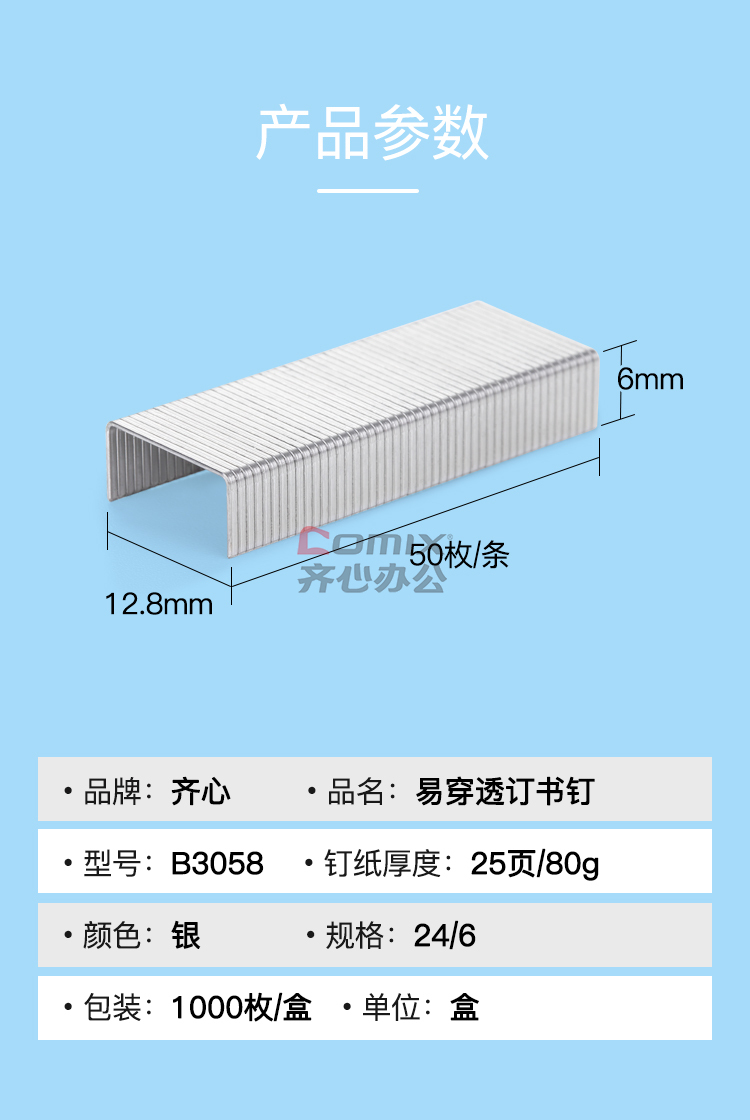 商品名称:齐心 B3058 优质高强度订书钉/统一钉/标准钉 12# 镍色 1000枚/盒 单位:盒