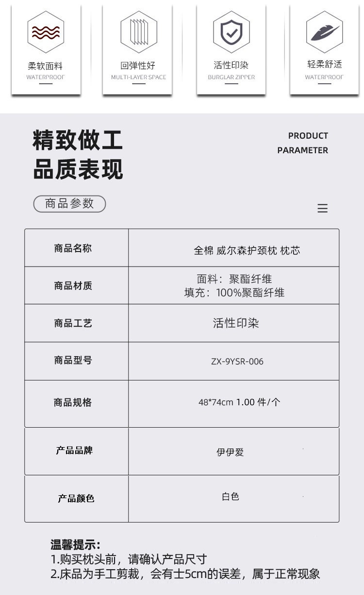 - 商品名称:伊伊爱 ZX-9YSR-006 48*74cm 全棉 威尔森护颈枕 枕芯 1.00 件/个 (计价单位:个) 白色