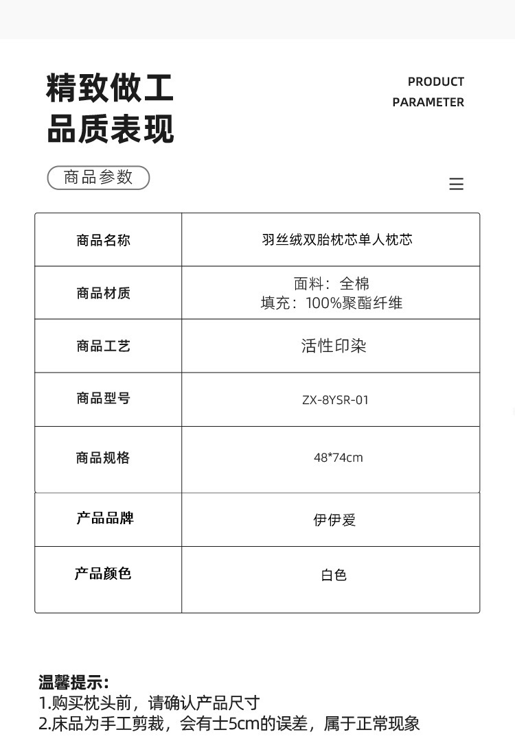 商品名称:伊伊爱 ZX-8YSR-01 羽丝绒双胎枕芯单人 枕芯 (计价单位:件) 白色